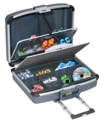 "longDescription": "<h2>Servicetrolley/Montagetrolley</h2><ul><li>Aus Polycarbonat, Rahmen aus Aluminium</li><li>Mit einer Hand zu öffnen und zu schließen</li><li>Deckel rastet beim Öffnen ein und bremst beim Schließen</li><li>Verschließbar mit Zahlenschloss</li><li>4-fach Teleskopauszug aus Aluminium</li><li>Leichtlaufende, verschleißfeste Räder, kugelgelagert</li></ul><br><br>Der Koffer<br>Dieser Servicetrolley der Serie ProServe von Allit ist aus Polycarbonat und somit äußerst robust und schlagfest. Der Profilrahmen ist aus Aluminium und schließt dicht ab. Der Koffer ist ganz einfach mit einer Hand zu öffnen und zu schließen: Zum Schließen einfach den Koffer zudrücken und zum Öffnen den Einhandhebel betätigen. Der Deckel rastet beim Öffnen ein und bleibt so in seiner Position. Zusätzlich verfügt er über eine integrierte Deckelbremse, welche einen Widerstand leistet und somit das Gewicht des Deckels beim Schließen kontrolliert. Der Koffer ist mit einem Zahlenschloss verschließbar und schützt Ihre Utensilien vor unbefugtem Zugriff.<br><br>Das Fahrwerk<br>Der Trolley hat einen 4-fachen Teleskopauszug aus Aluminium. Dieser wird mit einem Druckknopf betätigt. Die Räder mit Kugellager sind besonders leichtlaufend und äußerst verschleißfest. <br><br>Die Innenausstattung<br>Der Montagetrolley ist wahlweise als Grundmodell oder mit verschiedenen Innenausstattungen erhältlich. Das Grundmodell können Sie mit vielen Einteilungselementen individuell nach Ihren Bedürfnissen ausstatten. Sie können unter anderem zwischen Werkzeughaltern, Kleinteileboxen oder Schaumstoffeinlagen wählen.<br><br>Das Material<br>Polycarbonat hat eine hohe Festigkeit, Steifigkeit und Härte und besitzt gute Isolationseigenschaften gegen Strom. Außerdem hat das Material einen breiten Temperaturbereich und ist beständig gegenüber Wasser, vielen Ölen und Fetten, vielen Mineralsäuren und wässrigen Lösungen von neutralen Salzen und Oxidationsmitteln. Polycarbonat hat also eine sehr hohe Alterungsbeständigkeit und macht diesen Montagetrolley zu Ihrem langjährigen Begleiter.<br><br><strong>Gut zu wissen!</strong><br><br>Sie müssen eine Flugreise mit Ihrem Servicetrolley antreten? Dann bestellen Sie das Kofferband mit Zahlenschloss und TSA-Schloss gleich mit.<br>",