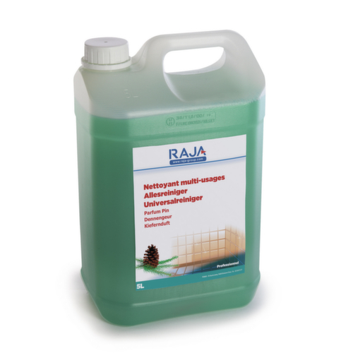 "longDescription": "<h2>Allzweckreiniger Tanne 5l</h2><p>Der Allzweckreiniger RAJA ist bestens geeignet für hartnäckige Verschmutzungen auf aller Art von Oberflächen und Böden. Der Allzweckreiniger ist ohne Spülen anwendbar. Er wirkt kraftvoll gegen Schmutz und verbreitet einen angenehmen Duft wahlweise nach Zitrone oder Tanne und erzeugt strahlenden Glanz. Der Mehrzweckreiniger von RAJA ist im großen 5 Liter Kanister erhältlich. - Mit Zitronen- oder Tannenduft erhältlich - 5 - Liter Kanister Allzweckreiniger- - 2 % Verdünnung nur 200 ml auf einen 10 Liter Eimer Wasser Entdecken Sie auch passende Bodentücher für die Fußbodenreinigung.</p><br>",