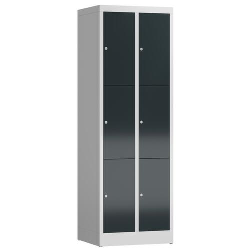 Flügeltür. Verschließbar mit Zylinderschloss. Konstruktion aus Stahl, verschweißt. Korpus mit elektrostatischer Pulverbeschichtung in RAL7035 Lichtgrau. Front mit elektrostatischer Pulverbeschichtung in RAL7016 Anthrazitgrau.