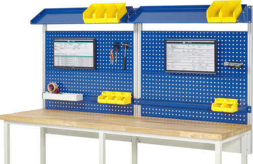 "value": "2 Befestigungssätze mit 4 Systemstützen, 2 Lochplatten, 2 Etagenbords, 2 Halteschienen für Sichtlagerkästen, 2 Flachbildschirmhalter, 2 Kartonagenmagazine"