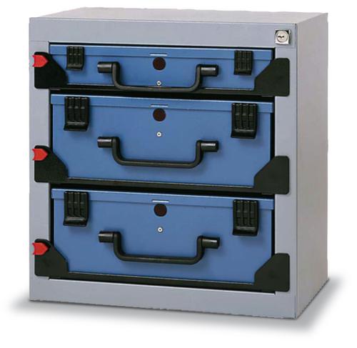 Aus Stahl, Korpus mit mit schlag- und kratzfester Pulverbeschichtung in RAL7000 fehgrau. Durch die kugelgelagerten Teleskopschienen öffnen und schließen sie, auch bei hoher Belastung, besonders leicht. Dabei gewährt der Vollauszug zu 100% einfachen Zugriff bis in die letzte Ecke. Die Einzelauszugsperre verhindert, dass mehrere Schubladen gleichzeitig geöffnet werden und damit ein Umkippen. Verschließbar über Sicherheitsschloss. 3 Koffer. Koffer aus Stahl. Koffer mit schlag- und kratzfester Pulverbeschichtung in RAL5007 Brillantblau. Kästen in farbig.