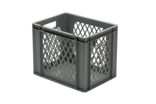 Maßlich auf die Europalette abgestimmt. Aus bruchsicherem Polypropylen in grau. Wände durchbrochen, Boden geschlossen. Einfacher Transport durch Tragegriffe. Mehrfach stapelbar. Lebensmittelgeeignet. Für Rollenbahnen geeignet. Temperaturbeständig -20 °C bis +80 °C. Geeignet für verschiedene Stoffe, bitte anfragen.