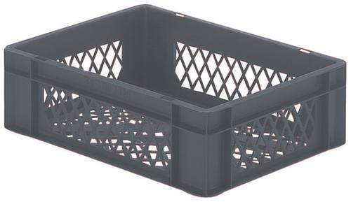 Maßlich auf die Europalette abgestimmt. Aus bruchsicherem Polypropylen in grau. Wände durchbrochen, Boden durchbrochen. Mehrfach stapelbar. Lebensmittelgeeignet. Für Rollenbahnen geeignet. Temperaturbeständig -20 °C bis +80 °C. Geeignet für verschiedene Stoffe, bitte anfragen.