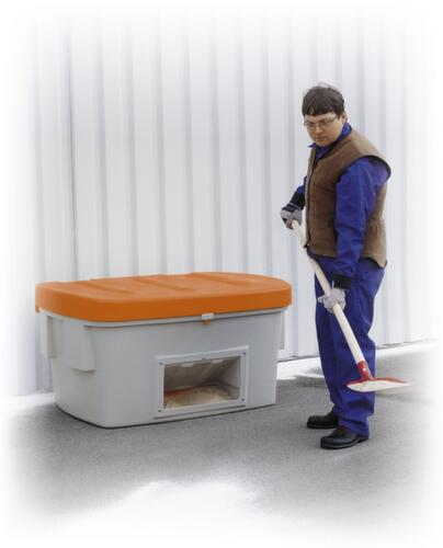 Aus schlagfestem Polyethylen. Ausgestattet mit schnell und einfach demontierbarem Klappdeckel - ganz ohne Werkzeug. Abschließbar: dank Einhängekonstruktion an Deckel und Korpus kann wahlweise bequem ein Vorhängeschloss angebracht werden. So ist stets ein Schutz vor unbefugtem Zugriff erreichbar. Behälter grau, Deckel orange. Wände geschlossen mit praktischer Entnahmeöffnung. Dadurch lässt sich Material einfach entnehmen, ganz ohne dass der Deckel geöffnet werden muss. Boden geschlossen. Mit offenem Deckel ineinander stapelbar.Bitte beachten Sie: Die Abbildung ist dem Produkt ähnlich.
