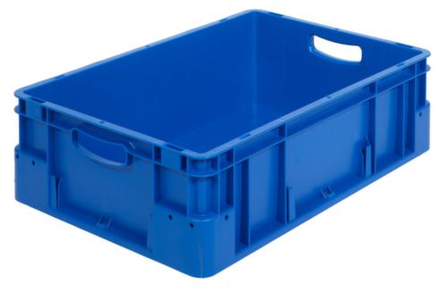 Maßlich auf die Europalette abgestimmt. Aus bruchsicherem Polypropylen in blau. Wände geschlossen, Boden geschlossen. Boden mit Verstärkung durch Verstärkungsrippen. Einfacher Transport durch Tragegriffe. Mit Etikettenhalter zur individuellen und klaren Beschriftung. Einfach zu stapeln mit Stapelrand sicher Mehrfach stapelbar. Lebensmittelgeeignet. Für Rollenbahnen geeignet. Temperaturbeständig -40 °C bis +90 °C. Geeignet für verschiedene Stoffe, bitte anfragen.