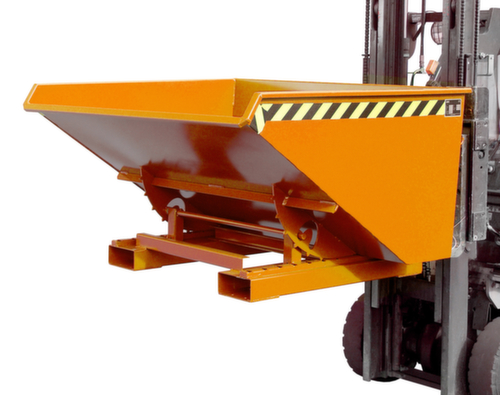 Der Kippvorgang wird bequem vom Fahrersitz aus per Zugseilentriegelung ausgelöst. Die Abrollkufen gewährleisten durch Ausnutzung des günstigen Lastenschwerpunktes eine sanftes Abkippen. Nach der Entleerung schwenkt der Kippbehälter automatisch wieder in die Ausgangsposition zurück und die Kippsicherung rastet wieder automatisch ein. Mit einer Sicherungskette an den Einfahrtaschen kann der Kippbehälter zusätzlich am Stapler gegen Abrutschen gesichert werden . Hohe Stabilität durch umlaufende gekantete Randverstärkung und stabilen Grundrahmen. Robuste Konstruktion aus Stahl mit Lackierung in RAL2000 Gelborange. Zum einfachen Transportieren und Entleeren nehmen Sie den Kippbehälter einfach mit dem Stapler über die Einfahrtaschen auf und bringen ihn auf die gewünschte Position und erforderliche Höhe.