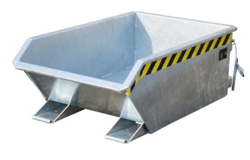 Die wichtigsten Maße des Bauer Kippbehälters MGU 270 auf einen BlickDer Kippvorgang wird bequem vom Fahrersitz aus per Zugseilentriegelung ausgelöst. Die Abrollkufen gewährleisten durch Ausnutzung des günstigen Lastenschwerpunktes eine sanftes Abkippen. mit Kippsicherung gegen unbeabsichtigtes Abrutschen. Mit einer Sicherungskette an den Einfahrtaschen kann der Kippbehälter zusätzlich am Stapler gegen Abrutschen gesichert werden . Robuste Konstruktion aus Stahl mit korrosionsschützender Zinkbeschichtung. Zum einfachen Transportieren und Entleeren nehmen Sie den Kippbehälter einfach mit dem Stapler über die Einfahrtaschen auf und bringen ihn auf die gewünschte Position und erforderliche Höhe.