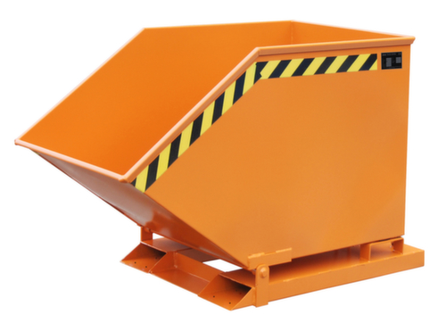 Die wichtigsten Maße des Bauer Kippbehälters auf einen BlickDer Kippvorgang wird bequem über eine Handgriff an der Rückseite manuell ausgelöst. Zum Schutz vor unbeabsichtigtem Auskippen rastet die Federkippsicherung beim Zurückführen des Behälters automatisch ein. Der Kippbehälter ist auch für die Aufnahme von Flüssigkeiten geeignet - öl- und wasserdicht verschweißt. Hohe Stabilität durch umlaufende gekantete Randverstärkung. Robuste Konstruktion aus Stahl mit Lackierung in RAL2000 Gelborange. Zum einfachen Transportieren und Entleeren nehmen Sie den Kippbehälter einfach mit dem Stapler über die Einfahrtaschen auf und bringen ihn auf die gewünschte Position und erforderliche Höhe.