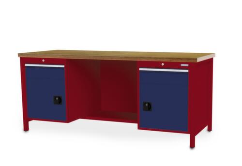 4-Fußgestell. Ausstattung: 2 Schubladen, 2 Schränke, 1/2 Ablageboden. Links 1 Schublade, 1 Schrank. Mitte 1/2 Ablageboden. Rechts 1 Schublade, 1 Schrank. Schubladen Höhe 2x150 mm. Schubladennutzmaß Breite x Tiefe 600 x 600 mm. Traglast je Schublade 100 kg. Schubladen mit kugelgelagerter Rollenführung, Auszug 100 %. Schubladen zur Aufnahme von Einteilungsmaterial geschlitzt. Mit Die Einzelauszugsperre verhindert, dass mehrere Schubladen gleichzeitig geöffnet werden und damit ein Umkippen. Griffleiste. Beschriftungsstreifen. Verschließbar mit Zylinderschloss. Konstruktion aus Stahl.