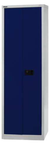 Konstruktion aus Stahl. Mit Doppel-Flügeltür. Traglast je Ebene 70 kg. Im Raster von 25 mm verstellbar. Mit Klappgriff. Verschließbar mit Zylinderschloss. Die 3-Punkt-Verriegelung bietet hohe Stabilität und einen effektiven Einbruchschutz. Unterbau: Der untergebaute Sockel sorgt dafür, dass das Gewicht des Schrankes gleichmäßig auf dem Boden verteilt wird. Dies erhöht die Stabilität und der Schrank kann schwerer Lasten aufnehmen, als ein Schrank mit Füßen. Außerdem können Schmutz, Staub und Feuchtigkeit nicht unter den Schrank gelangen, was die Reinigungsfläche verkleinert. Korpus mit Lackierung in lichtgrau. Front mit Lackierung in oxfordblau. Ebenen mit Lackierung in lichtgrau.