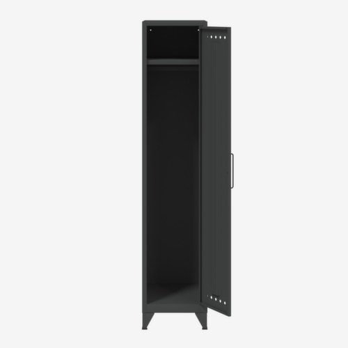 Die wichtigsten Maße des Bisley Garderobenschranks Fern Locker auf einen Blick:Je Abteil Hutboden und Kleiderstange. Dank der Flügeltür haben Sie eine staubgeschützte Lagerung und Übersichtlichkeit in Einem. Tür bündig mit dem Korpus abschließend. Über die Design-Lüftungslöcher in der Tür kann eine kontinuierliche Luftzirkulation stattfinden. 4 Füße sorgen für einen sicheren Stand. Konstruktion aus Stahl, verschweißt. Korpus mit Lackierung in anthrazit, Front mit Lackierung in anthrazit.