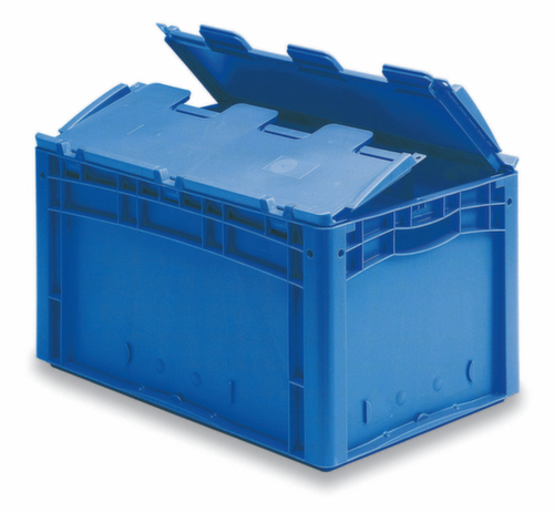 Maßlich auf die Europalette abgestimmt. Aus bruchsicherem Polypropylen in blau. Wände geschlossen, Boden geschlossen. Boden mit Verstärkung durch Verstärkungsrippen. Das Lagergut ist vor Staub und Schmutz geschützt durch den zweiteiligen Scharnierdeckel. Einfacher Transport durch Tragegriffe. Mehrfach stapelbar. Lebensmittelgeeignet.