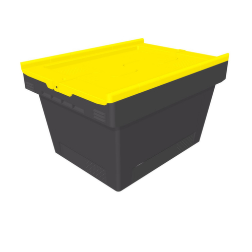 Aus Polypropylen-Regenerat. Das Lagergut lässt sich durch die geschlossenen Wände vor Staub geschützt lagern und der Behälter lässt sich leicht reinigen. Boden geschlossen. Zweiteiliger Klappdeckel in postgelb. Deckel aus Neugranulat. Mehrfach stapelbar. Mit offenem Deckel ineinander stapelbar.