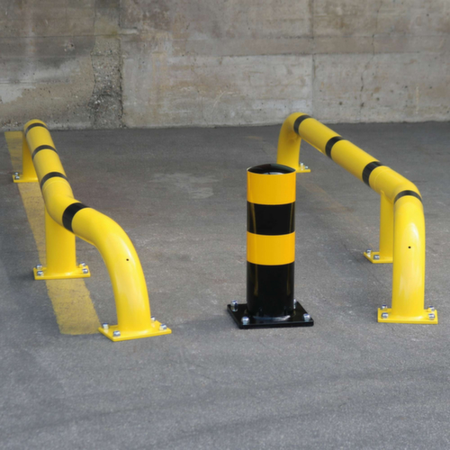 Die wichtigsten Maße des BLACK BULL Rammschutzsystems auf einen Blick:Konstruktion Eine gute Sichtbarkeit wird durch die farbigen Reflexstreifen ermöglicht. Aus Stahlrohr feuerverzinkt mit Kunststoffbeschichtung in gelb/schwarz. Zum Aufdübeln mit Bodenplatte.