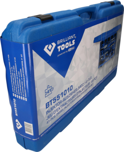 "longDescription": "<ul><li class=\"liste\">41-teiliger Satz</li><li class=\"liste\">erleichtert die Demontage der Diesel-Injektoren</li><li class=\"liste\">durch reichhaltige Adaptierung für die gängigsten Injektoren geeignet</li></ul><br />Der BRILLIANT TOOLS Injektor-Auszieher-Satz BT551010 ist ein spezieller Werkzeugsatz zum sicheren Entfernen von Dieselinjektoren, ohne dass der Zylinderkopf ausgebaut werden muss. Durch die zahlreichen Adapter eignet sich dieses Set für die meisten Dieselinjektoren von Kraftfahrzeugen und ist vor allem im kommerziellen Werkstattbetrieb von hohem Nutzen. Doch auch Autodidakten können mithilfe dieses Abziehersatzes einen sicheren Ausbau der Dieselinjektoren ohne Schäden durchführen. Gehen Sie den sichersten Weg mit dem BRILLIANT TOOLS Injektor-Auszieher-Satz. Da dieser Werkzeugsatz eine Vielzahl an Werkzeugteilen und Adaptern beinhaltet, kann das Set bei den meisten Dieselmotoren zum Einsatz kommen. Mit dem professionellen Abzieher-Satz sind Sie für alle Reparaturen an diversen Injektoren unterschiedlicher Größe perfekt ausgerüstet. So können verkokte Injektoren professionell ausgebaut werden. Die drei verschiedenen Gleithämmer sind aus verchromtem Stahl gefertigt und überzeugen mit einer höheren Korrosionsresistenz. Das komplette Set ist in einem praktischen Kunststoff-Werkzeugkoffer untergebracht, der für jedes Einzelteil eine Aussparung besitzt. So kann jedes Werkzeugelement nach Gebrauch sicher und ordentlich verwahrt werden. Der Koffer lässt sich dank des Tragegriffes bequem transportieren, während Clips den Inhalt stark festhalten. Dank der hochwertigen Werkzeugverarbeitung, der Vielzahl an einzelnen Adaptern und drei verschiedenen Gleithämmern liefert das Abzieher-Set alles, was Sie für eine professionelle und einfache Demontage von Dieselinjektoren benötigen. Das Dieselinjektor-Abzieher-Set darf daher als Profi-Werkzeugsatz in keiner Werkstatt fehlen.<br /><br /><strong>Lieferumfang:</strong><br /><br />1 x Gleithammer 1,6 Kg, 16 cm lang<br />1 x Gleithammer 2,7 Kg, 46 cm lang<br />1 x Gleithammer 5,1 Kg, 60 cm lang<br />1 x Ausziehklaue mit Gabelöffnung 13,7 x 18 mm, 10,5 cm lang<br />1 x Ausziehklaue mit Gabelöffnung 12,7 x 19 mm, 13 cm lang<br />5 x Bitstecknüsse Schlitz, 12,5mm (1/2'), 10 cm lang in SW: 25 - 27 - 28 - 29 - 30 mm<br />1 x Injektor-Auszieher in Hülsenbauform mit Stützschalen Außen Ø 35 mm, Innen Ø 29 mm<br />1 x Spindel mit M17 x 1,0 Außengewinde<br />3 x Ausziehadapter mit Außengewinde M27 x 1,0<br />1 x Ausziehadapter mit Außengewinde M25 x 1,0<br />3 x Ausziehadapter mit Innengewinde M27 x 1,0<br />1 x Gleithammeradaptierung für Innen-, Aussen- und Klauen-Auszieher<br /><br />UNSERE QUALITÄT: BRILLIANT<br />UNSERE PREISE: SMART<br /><br />In jedem Werkzeug steckt mehr als ein viertel Jahrhundert Erfahrungen unserer Experten. Diese kompromisslose Qualität, Profi-Werkzeuge mit höchster Qualität für den harten Arbeitsalltag, ist eines der Erfolgsrezepte für uns. Wir verzichten auf eine große Vertriebsstruktur und extravagante Marketing-Aktivitäten und können Dir die Produkte daher zu einem sensationell günstigen Preis-/Leistungsverhältnis anbieten. Spare bares Geld ohne Deine Qualitätsansprüche herunterzuschrauben!<br /><br />Ein Qualitätswerkzeug powered by KS TOOLS.<br /><br>",