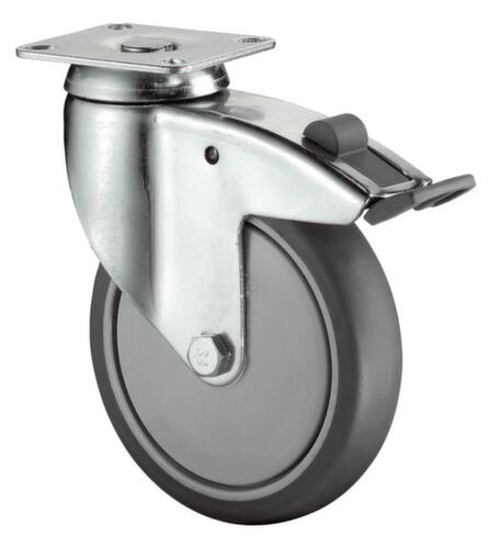 Nabe mit für den Dauerbetrieb geeignetem Kugellager. Doppelstopp zum gleichzeitigen Blockieren von Lenkung und Rad. Felge aus Kunststoff. Felge mit Fadenschutz, der ein Verheddern verhindert und dafür sorgt, dass die Rolle weniger häufig gewartet werden muss. Gehäuse aus Stahl mit korrosionsschützender Zinkbeschichtung. Befestigung mit Platte, Länge x Breite 95 x 70 mm. Schwenklager mit Kugellager.