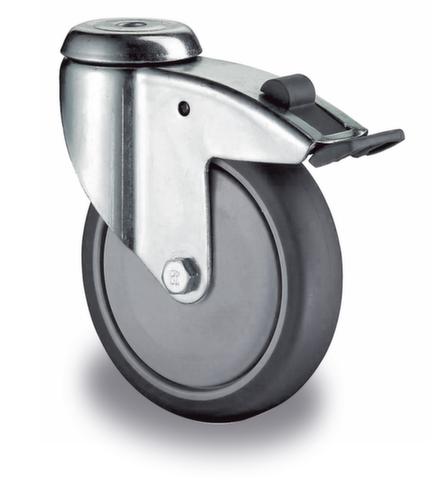 Nabe mit für den Dauerbetrieb geeignetem Kugellager. Doppelstopp zum gleichzeitigen Blockieren von Lenkung und Rad. Felge aus Kunststoff. Felge mit Fadenschutz, der ein Verheddern verhindert und dafür sorgt, dass die Rolle weniger häufig gewartet werden muss. Gehäuse aus Stahl mit korrosionsschützender Zinkbeschichtung. Befestigung mit Rückenloch, Ø 12,2 mm. Schwenklager mit Kugellager.