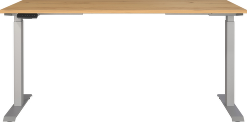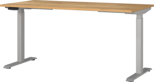 Platte aus Spanplatte mit kratzfester und pflegeleichter Melaminharzbeschichtung in Dekor Navarra-Eiche. Kante mit schlagfestem ABS-Umleimer, der vor unschönen Rissen und Ausbrechen schützt. Doppel-T-Fußgestell aus Metall mit schlag- und kratzfester Pulverbeschichtung in silber. Gestell mit nivellierbaren Kunststoffgleitern, mit denen sich Bodenunebenheiten optimal ausbessern lassen. Mit Stromkabel, Stecker und Bedieneinheit elektrifizierbar.