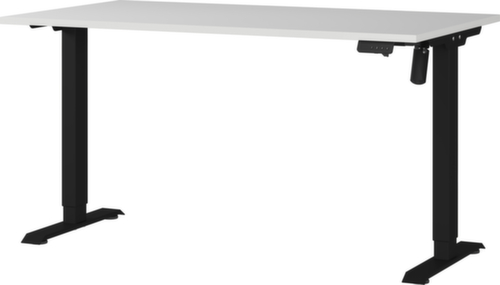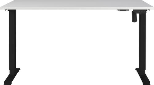 Platte aus Spanplatte mit pflegeleichter Melaminharzbeschichtung in Dekor lichtgrau. Kante mit schlagfestem ABS-Umleimer, der vor unschönen Rissen und Ausbrechen schützt. T-Fußgestell aus Metall mit schlag- und kratzfester Pulverbeschichtung in schwarz. Höhenverstellung durch Elektromotor. Gestell mit nivellierbaren Kunststoffgleitern, mit denen sich Bodenunebenheiten optimal ausbessern lassen.