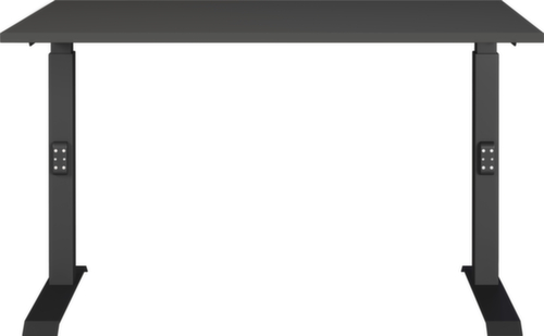 Platte aus Spanplatte mit pflegeleichter Melaminharzbeschichtung in Dekor graphit. Kante mit schlagfestem ABS-Umleimer, der vor unschönen Rissen und Ausbrechen schützt. C-Fußgestell aus Metall mit schlag- und kratzfester Pulverbeschichtung in schwarz. Höhenverstellung durch Mechanik. Gestell mit nivellierbaren Kunststoffgleitern, mit denen sich Bodenunebenheiten optimal ausbessern lassen.