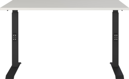 Platte aus Spanplatte mit pflegeleichter Melaminharzbeschichtung in Dekor lichtgrau. Kante mit schlagfestem ABS-Umleimer, der vor unschönen Rissen und Ausbrechen schützt. C-Fußgestell aus Metall mit schlag- und kratzfester Pulverbeschichtung in schwarz. Höhenverstellung durch Mechanik. Gestell mit nivellierbaren Kunststoffgleitern, mit denen sich Bodenunebenheiten optimal ausbessern lassen.