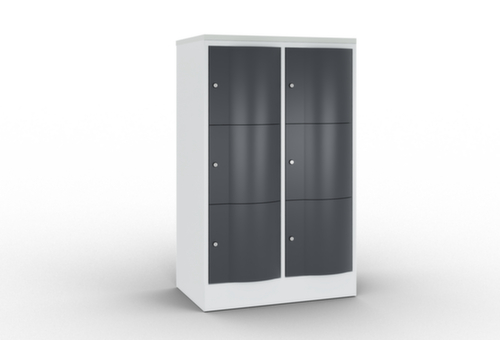 Die nach vorne gewölbte Flügeltür ist absolut stabil und vandalismussicher, sogar gegen Fußtritte. Die einschlagenden Türen sind in robusten, innenliegenden Drehstangenscharnieren aufgehängt und halte damit auch hohen Beanspruchungen stand. Jede Tür ist serienmäßig mit einer Anschlagsdämpfung ausgestattet, so dass, auch durch ein schwungvolles Schließen, die Tür nicht zuknallt. Das trägt nicht nur zu einer angenehmeren Geräuschkulisse bei, sondern schont auch den Stahlschrank vor Beschädigungen. Zudem schützt die Türöffnungsbegrenzung vor einer Überdehnung der Tür und vor der Überschneidung der Nutzfläche mit dem Nachbarschrank. Verschließbar mit Zylinderschloss. Die Lüftungsöffnungen in der Rückwand stellen eine gute Luftzirkulation in jedem Schrankfach sicher. Durch die Abdeckplatte kann der Beistellschrank als zusätzliche Arbeits- oder Ablagefläche genutzt werden. Der untergebaute Sockel sorgt dafür, dass das Gewicht des Schrankes gleichmäßig auf dem Boden verteilt wird. Dies erhöht die Stabilität und der Schrank kann schwerer Lasten aufnehmen, als ein Schrank mit Füßen. Außerdem können Schmutz, Staub und Feuchtigkeit nicht unter den Schrank gelangen, was die Reinigungsfläche verkleinert. Konstruktion aus Stahlblech, verschweißt. Korpus mit Einbrennlackierung. Front mit Einbrennlackierung. Platte in Dekor Korpusfarbe.