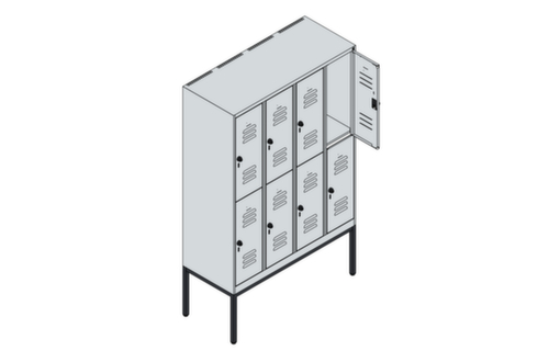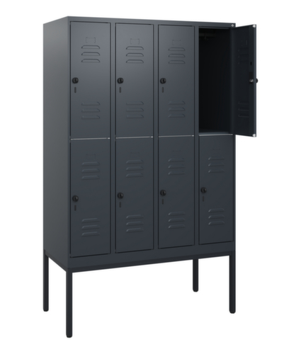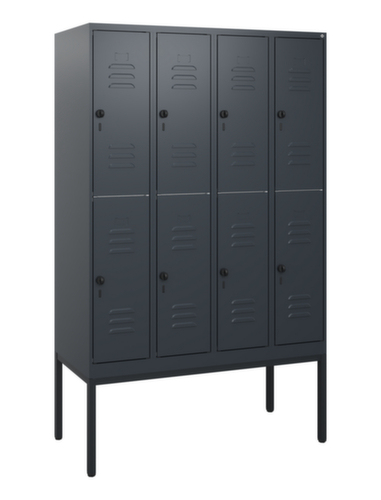 Die wichtigsten Maße des C+P Garderobenschranks Classic Plus auf einen Blick:Je Abteil 2 Schrankfächer mit je einer Kleiderstange und 3 verdrehsicheren Doppelschiebehaken. Flügeltür mit Etikettenrahmen und Lüftungsschlitzen. Die innenliegenden Drehbolzen der einschlagenden Türen bieten den Vorteil einer sauberen Optik, da keine Schrauben oder Scharniere von außen sichtbar sind. Dadurch wird das Design des Schrankes nicht beeinträchtigt und das gesamte Möbelstück wirkt hochwertiger. Damit ist auch die glatte Oberfläche leichter zu reinigen, da keine Schmutz- oder Staubablagerungen an unzugänglichen Stellen zu befürchten sind. Jede Tür ist serienmäßig mit einer Anschlagsdämpfung ausgestattet, so dass, auch durch ein schwungvolles Schließen, die Tür nicht zuknallt. Das trägt nicht nur zu einer angenehmeren Geräuschkulisse bei, sondern schont auch den Stahlschrank vor Beschädigungen. Von der Natur inspiriert schafft der BIONIC Steel Frame eine besonders effiziente und stabile Konstruktion. Durch eine raffinierte innere Struktur aus Faltungen, Streben und Zwischenräumen, sowie höhere Materialstärke an entscheidenden Stellen, wie z. B. im vorderen Bereich der Seitenwände und in den Trennwand- und Kastenprofilen, wird die Verwindungssteifigkeit zusätzlich erhöht. Verschließbar mit Sicherheits-Drehriegel für Vorhängeschloss. Das Sicherheitsschloss ist besonders aufbruchsicher, da es im verschlossenen Zustand durchdreht und erst nach Entfernung des Schlosses einrastet. Passend für alle Vorhängeschlösser mit einer Bügelstärke von 6 - 8 mm. Die zusätzlichen Lüftungsöffnungen im Abteil, kombiniert mit den Lüftungsschlitzen in der Tür, verbessern den Luftstrom. Dadurch wird der Schrankinhalt besser belüftet und trocknet schneller, ohne unangenehme Gerüche zu verursachen. Das untergebaute Fußgestell reduziert mögliche Ansammlungen von Schmutz und Staub, da eine vollflächige Reinigung einfach möglich ist. Zudem wird zusätzlicher Stauraum unter dem Schrank geschaffen. Schuhe und Taschen stehen nicht mehr im Raum und stellen weniger Stolpergefahr dar. Konstruktion aus Stahl, stabil verschweißt. Das macht die Konstruktion besonders robust und widerstandsfähig und somit langlebiger. Die verschweißten Ecken und Kanten des Korpus gewährleisten eine höhere Dichtigkeit und somit eine bessere Schutzfunktion gegen Staub, Feuchtigkeit und Schmutz als eine geschraubte Konstruktion. Zudem sind keine regelmäßigen Wartungsarbeiten und Nachjustierungen nötig. Korpus mit Einbrennlackierung in RAL7016 Anthrazitgrau, Front mit Einbrennlackierung in RAL7016 Anthrazitgrau.