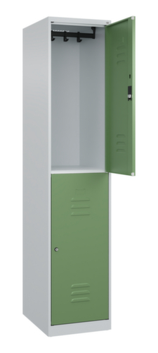 Die wichtigsten Maße des C+P Garderobenschranks Classic Plus auf einen Blick:Je Abteil 2 Schrankfächer mit je einer Kleiderstange und 3 verdrehsicheren Doppelschiebehaken. Flügeltür mit Etikettenrahmen und Lüftungsschlitzen. Die innenliegenden Drehbolzen der einschlagenden Türen bieten den Vorteil einer sauberen Optik, da keine Schrauben oder Scharniere von außen sichtbar sind. Dadurch wird das Design des Schrankes nicht beeinträchtigt und das gesamte Möbelstück wirkt hochwertiger. Damit ist auch die glatte Oberfläche leichter zu reinigen, da keine Schmutz- oder Staubablagerungen an unzugänglichen Stellen zu befürchten sind. Jede Tür ist serienmäßig mit einer Anschlagsdämpfung ausgestattet, so dass, auch durch ein schwungvolles Schließen, die Tür nicht zuknallt. Das trägt nicht nur zu einer angenehmeren Geräuschkulisse bei, sondern schont auch den Stahlschrank vor Beschädigungen. Von der Natur inspiriert schafft der BIONIC Steel Frame eine besonders effiziente und stabile Konstruktion. Durch eine raffinierte innere Struktur aus Faltungen, Streben und Zwischenräumen, sowie höhere Materialstärke an entscheidenden Stellen, wie z. B. im vorderen Bereich der Seitenwände und in den Trennwand- und Kastenprofilen, wird die Verwindungssteifigkeit zusätzlich erhöht. Verschließbar mit Zylinderschloss. Die zusätzlichen Lüftungsöffnungen im Abteil, kombiniert mit den Lüftungsschlitzen in der Tür, verbessern den Luftstrom. Dadurch wird der Schrankinhalt besser belüftet und trocknet schneller, ohne unangenehme Gerüche zu verursachen. Für eine besonders schlanke und raumsparende Optik steht der Schrank ohne Sockel oder Füße direkt auf dem Boden. Lediglich Bodenausgleichsschrauben sorgen für einen wackelfreien Stand bei eventuellen Bodenunebenheiten. Der Schrankboden ist für einen erhöhten Korrosionsschutz zusätzlich verzinkt. Konstruktion aus Stahl, stabil verschweißt. Das macht die Konstruktion besonders robust und widerstandsfähig und somit langlebiger. Die verschweißten Ecken und Kanten des Korpus gewährleisten eine höhere Dichtigkeit und somit eine bessere Schutzfunktion gegen Staub, Feuchtigkeit und Schmutz als eine geschraubte Konstruktion. Zudem sind keine regelmäßigen Wartungsarbeiten und Nachjustierungen nötig. Korpus mit Einbrennlackierung in RAL7035 Lichtgrau, Front mit Einbrennlackierung in RAL6011 Resedagrün.