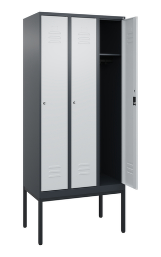 Die wichtigsten Maße des C+P Garderobenschranks Classic Plus auf einen Blick:Je Abteil ein festverschweißter Hutboden und darunter eine Kleiderstange mit 3 verdrehsicheren Doppelschiebehaken. Flügeltür mit Etikettenrahmen und Lüftungsschlitzen. Die innenliegenden Drehbolzen der einschlagenden Türen bieten den Vorteil einer sauberen Optik, da keine Schrauben oder Scharniere von außen sichtbar sind. Dadurch wird das Design des Schrankes nicht beeinträchtigt und das gesamte Möbelstück wirkt hochwertiger. Damit ist auch die glatte Oberfläche leichter zu reinigen, da keine Schmutz- oder Staubablagerungen an unzugänglichen Stellen zu befürchten sind. Jede Tür ist serienmäßig mit einer Anschlagsdämpfung ausgestattet, so dass, auch durch ein schwungvolles Schließen, die Tür nicht zuknallt. Das trägt nicht nur zu einer angenehmeren Geräuschkulisse bei, sondern schont auch den Stahlschrank vor Beschädigungen. Von der Natur inspiriert schafft der BIONIC Steel Frame eine besonders effiziente und stabile Konstruktion. Durch eine raffinierte innere Struktur aus Faltungen, Streben und Zwischenräumen, sowie höhere Materialstärke an entscheidenden Stellen, wie z. B. im vorderen Bereich der Seitenwände und in den Trennwand- und Kastenprofilen, wird die Verwindungssteifigkeit zusätzlich erhöht. Verschließbar mit Zylinderschloss. Die zusätzlichen Lüftungsöffnungen im Abteil, kombiniert mit den Lüftungsschlitzen in der Tür, verbessern den Luftstrom. Dadurch wird der Schrankinhalt besser belüftet und trocknet schneller, ohne unangenehme Gerüche zu verursachen. Das untergebaute Fußgestell reduziert mögliche Ansammlungen von Schmutz und Staub, da eine vollflächige Reinigung einfach möglich ist. Zudem wird zusätzlicher Stauraum unter dem Schrank geschaffen. Schuhe und Taschen stehen nicht mehr im Raum und stellen weniger Stolpergefahr dar. Konstruktion aus Stahl, stabil verschweißt. Das macht die Konstruktion besonders robust und widerstandsfähig und somit langlebiger. Die verschweißten Ecken und Kanten des Korpus gewährleisten eine höhere Dichtigkeit und somit eine bessere Schutzfunktion gegen Staub, Feuchtigkeit und Schmutz als eine geschraubte Konstruktion. Zudem sind keine regelmäßigen Wartungsarbeiten und Nachjustierungen nötig. Korpus mit Einbrennlackierung in RAL7016 Anthrazitgrau, Front mit Einbrennlackierung in RAL7035 Lichtgrau.