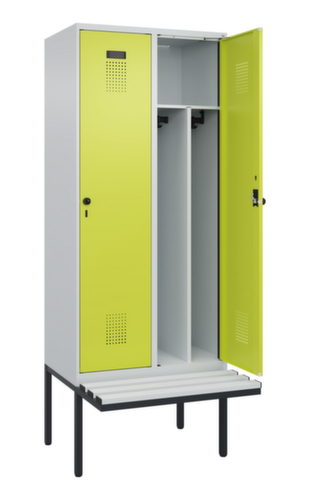 Die wichtigsten Maße des C+P Garderobenschranks Evolo PLUS auf einen Blick:Je Abteil ein festverschweißter Hutboden und darunter zwei Kleiderstangen mit je 2 verdrehsicheren Doppelschiebehaken. Das Abteil wird unter dem Hutboden durch eine Mitteltrennwand unterteilt. Dadurch ist eine saubere Schwarz-Weiß-Trennung von Arbeits- und Alltagskleidung möglich. Die Flügeltüren können über den Comfort-Etikettrahmen ganz einfach personalisiert werden. Dank des Desinglochbildes, was essentiell zur Belüftung beiträgt, bleibt der Schrank trotzdem in seinem gesamten Erscheinungsbild glatt, hygienisch und leicht zu reinigen. Die innenliegenden Drehbolzen der einschlagenden Türen bieten den Vorteil einer sauberen Optik, da keine Schrauben oder Scharniere von außen sichtbar sind. Dadurch wird das Design des Schrankes nicht beeinträchtigt und das gesamte Möbelstück wirkt hochwertiger. Damit ist auch die glatte Oberfläche leichter zu reinigen, da keine Schmutz- oder Staubablagerungen an unzugänglichen Stellen zu befürchten sind. Jede Tür ist serienmäßig mit einer Anschlagsdämpfung ausgestattet, so dass, auch durch ein schwungvolles Schließen, die Tür nicht zuknallt. Das trägt nicht nur zu einer angenehmeren Geräuschkulisse bei, sondern schont auch den Stahlschrank vor Beschädigungen. Von der Natur inspiriert schafft der BIONIC Steel Frame eine besonders effiziente und stabile Konstruktion. Durch eine raffinierte innere Struktur aus Faltungen, Streben und Zwischenräumen, sowie höhere Materialstärke an entscheidenden Stellen, wie z. B. im vorderen Bereich der Seitenwände und in den Trennwand- und Kastenprofilen, wird die Verwindungssteifigkeit zusätzlich erhöht. Das durchdachte Selbstbelüftungskonzept ermöglicht einen konstruktiv optimierte Luftzirkulation. Definierte Lüftungsfreiräume vor und hinter dem Ablageboden, Lüftungsöffnungen in Abteilboden und -dach, in Kombination mit dem Lochbild in der Tür, tragen zu einer angenehmen Strömungsverlauf bei. . Dadurch wird der Schrankinhalt ausreichend belüftet und trocknet schneller, ohne unangenehme Gerüche zu verursachen. Die schwebende Sitzbank bietet mehr Freiraum für ein bequemes An- und Ausziehen, ohne dass die Füße des Gestells im Weg sind. Die Leisten sind aus Kunststoff mit Stahlkern - hygienische, pflegeleichte und zugleich extrem stabile Sitzfläche. Durch ihre hohe Belastbarkeit und Langlebigkeit besonders für stark frequentierte Umkleiden geeignet. Das untergebaute Fußgestell reduziert mögliche Ansammlungen von Schmutz und Staub, da eine vollflächige Reinigung einfach möglich ist. Zudem wird zusätzlicher Stauraum unter dem Schrank geschaffen. Schuhe und Taschen stehen nicht mehr im Raum und stellen weniger Stolpergefahr dar. Konstruktion aus Stahl, stabil verschweißt. Das macht die Konstruktion besonders robust und widerstandsfähig und somit langlebiger. Die verschweißten Ecken und Kanten des Korpus gewährleisten eine höhere Dichtigkeit und somit eine bessere Schutzfunktion gegen Staub, Feuchtigkeit und Schmutz als eine geschraubte Konstruktion. Zudem sind keine regelmäßigen Wartungsarbeiten und Nachjustierungen nötig. Korpus mit Einbrennlackierung in RAL7035 Lichtgrau, Front mit Einbrennlackierung in RAL1108060 Clowngrün.
