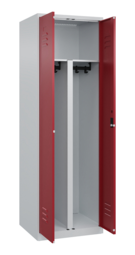 . Die wichtigsten Maße des C+P Garderobenschranks Classic Plus auf einen Blick:Je Abteil 1 stabile Garderobenstange aus Ovalprofil mit 3 verdrehsicheren Doppelschiebehaken, oberhalb ein durchgehender Hutboden über je 2 Abteile. Diese extra breite Ablage bietet den idealen Stauraum für PSA-Ausrüstung wie z. B. Helme, Augen- oder Gehörschutz. Doppel-Flügeltür mit Lüftungsschlitzen und Etikettenrahmen. Die innenliegenden Drehbolzen der einschlagenden Türen bieten den Vorteil einer sauberen Optik, da keine Schrauben oder Scharniere von außen sichtbar sind. Dadurch wird das Design des Schrankes nicht beeinträchtigt und das gesamte Möbelstück wirkt hochwertiger. Damit ist auch die glatte Oberfläche leichter zu reinigen, da keine Schmutz- oder Staubablagerungen an unzugänglichen Stellen zu befürchten sind. Jede Tür ist serienmäßig mit einer Anschlagsdämpfung ausgestattet, so dass, auch durch ein schwungvolles Schließen, die Tür nicht zuknallt. Das trägt nicht nur zu einer angenehmeren Geräuschkulisse bei, sondern schont auch den Stahlschrank vor Beschädigungen. Von der Natur inspiriert schafft der BIONIC Steel Frame eine besonders effiziente und stabile Konstruktion. Durch eine raffinierte innere Struktur aus Faltungen, Streben und Zwischenräumen, sowie höhere Materialstärke an entscheidenden Stellen, wie z. B. im vorderen Bereich der Seitenwände und in den Trennwand- und Kastenprofilen, wird die Verwindungssteifigkeit zusätzlich erhöht. Verschließbar mit Zylinderschloss. Pro Person stehen 2 Abteile zur Verfügung, die über die zueinander schlagenden Türen gemeinsam verschließbar sind. Dadurch ist eine strikte und saubere Trennung von Arbeits- und Alltagskleidung ganz einfach möglich. Die zusätzlichen Lüftungsöffnungen im Abteil, kombiniert mit den Lüftungsschlitzen in der Tür, verbessern den Luftstrom. Dadurch wird der Schrankinhalt besser belüftet und trocknet schneller, ohne unangenehme Gerüche zu verursachen. Für eine besonders schlanke und raumsparende Optik steht der Schrank ohne Sockel oder Füße direkt auf dem Boden. Lediglich Bodenausgleichsschrauben sorgen für einen wackelfreien Stand bei eventuellen Bodenunebenheiten. Der Schrankboden ist für einen erhöhten Korrosionsschutz zusätzlich verzinkt. Konstruktion aus Stahl, stabil verschweißt. Das macht die Konstruktion besonders robust und widerstandsfähig und somit langlebiger. Die verschweißten Ecken und Kanten des Korpus gewährleisten eine höhere Dichtigkeit und somit eine bessere Schutzfunktion gegen Staub, Feuchtigkeit und Schmutz als eine geschraubte Konstruktion. Zudem sind keine regelmäßigen Wartungsarbeiten und Nachjustierungen nötig. Korpus mit Einbrennlackierung in RAL7035 Lichtgrau, Front mit Einbrennlackierung in RAL3003 Rubinrot.