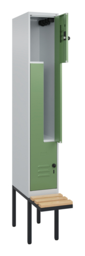 Die wichtigsten Maße des C+P Garderobenschranks Classic Plus auf einen Blick:Je Abteil eine Kleiderstange mit 3 verdrehsicheren Doppelschiebehaken. Z-Flügeltür mit Etikettenrahmen und Lüftungsschlitzen. Die innenliegenden Drehbolzen der einschlagenden Türen bieten den Vorteil einer sauberen Optik, da keine Schrauben oder Scharniere von außen sichtbar sind. Dadurch wird das Design des Schrankes nicht beeinträchtigt und das gesamte Möbelstück wirkt hochwertiger. Damit ist auch die glatte Oberfläche leichter zu reinigen, da keine Schmutz- oder Staubablagerungen an unzugänglichen Stellen zu befürchten sind. Jede Tür ist serienmäßig mit einer Anschlagsdämpfung ausgestattet, so dass, auch durch ein schwungvolles Schließen, die Tür nicht zuknallt. Das trägt nicht nur zu einer angenehmeren Geräuschkulisse bei, sondern schont auch den Stahlschrank vor Beschädigungen. Von der Natur inspiriert schafft der BIONIC Steel Frame eine besonders effiziente und stabile Konstruktion. Durch eine raffinierte innere Struktur aus Faltungen, Streben und Zwischenräumen, sowie höhere Materialstärke an entscheidenden Stellen, wie z. B. im vorderen Bereich der Seitenwände und in den Trennwand- und Kastenprofilen, wird die Verwindungssteifigkeit zusätzlich erhöht. Verschließbar mit Sicherheits-Drehriegel für Vorhängeschloss. Das Sicherheitsschloss ist besonders aufbruchsicher, da es im verschlossenen Zustand durchdreht und erst nach Entfernung des Schlosses einrastet. Passend für alle Vorhängeschlösser mit einer Bügelstärke von 6 - 8 mm. Die zusätzlichen Lüftungsöffnungen im Abteil, kombiniert mit den Lüftungsschlitzen in der Tür, verbessern den Luftstrom. Dadurch wird der Schrankinhalt besser belüftet und trocknet schneller, ohne unangenehme Gerüche zu verursachen. Die schwebende Sitzbank bietet mehr Freiraum für ein bequemes An- und Ausziehen, ohne dass die Füße des Gestells im Weg sind. Die Leisten sind aus Buchenholz. Konstruktion aus Stahl, stabil verschweißt. Das macht die Konstruktion besonders robust und widerstandsfähig und somit langlebiger. Die verschweißten Ecken und Kanten des Korpus gewährleisten eine höhere Dichtigkeit und somit eine bessere Schutzfunktion gegen Staub, Feuchtigkeit und Schmutz als eine geschraubte Konstruktion. Zudem sind keine regelmäßigen Wartungsarbeiten und Nachjustierungen nötig. Korpus mit Einbrennlackierung in RAL7035 Lichtgrau, Front mit Einbrennlackierung in RAL6011 Resedagrün.