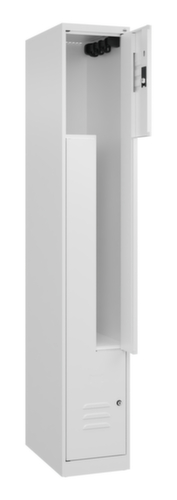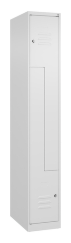 Die wichtigsten Maße des C+P Garderobenschranks Classic Plus auf einen Blick:Je Abteil eine Kleiderstange mit 3 verdrehsicheren Doppelschiebehaken. Flügeltür mit Etikettenrahmen und Lüftungsschlitzen. Die innenliegenden Drehbolzen der einschlagenden Türen bieten den Vorteil einer sauberen Optik, da keine Schrauben oder Scharniere von außen sichtbar sind. Dadurch wird das Design des Schrankes nicht beeinträchtigt und das gesamte Möbelstück wirkt hochwertiger. Damit ist auch die glatte Oberfläche leichter zu reinigen, da keine Schmutz- oder Staubablagerungen an unzugänglichen Stellen zu befürchten sind. Jede Tür ist serienmäßig mit einer Anschlagsdämpfung ausgestattet, so dass, auch durch ein schwungvolles Schließen, die Tür nicht zuknallt. Das trägt nicht nur zu einer angenehmeren Geräuschkulisse bei, sondern schont auch den Stahlschrank vor Beschädigungen. Von der Natur inspiriert schafft der BIONIC Steel Frame eine besonders effiziente und stabile Konstruktion. Durch eine raffinierte innere Struktur aus Faltungen, Streben und Zwischenräumen, sowie höhere Materialstärke an entscheidenden Stellen, wie z. B. im vorderen Bereich der Seitenwände und in den Trennwand- und Kastenprofilen, wird die Verwindungssteifigkeit zusätzlich erhöht. Verschließbar mit Zylinderschloss. Die zusätzlichen Lüftungsöffnungen im Abteil, kombiniert mit den Lüftungsschlitzen in der Tür, verbessern den Luftstrom. Dadurch wird der Schrankinhalt besser belüftet und trocknet schneller, ohne unangenehme Gerüche zu verursachen. Für eine besonders schlanke und raumsparende Optik steht der Schrank ohne Sockel oder Füße direkt auf dem Boden. Lediglich Bodenausgleichsschrauben sorgen für einen wackelfreien Stand bei eventuellen Bodenunebenheiten. Der Schrankboden ist für einen erhöhten Korrosionsschutz zusätzlich verzinkt. Konstruktion aus Stahl, stabil verschweißt. Das macht die Konstruktion besonders robust und widerstandsfähig und somit langlebiger. Die verschweißten Ecken und Kanten des Korpus gewährleisten eine höhere Dichtigkeit und somit eine bessere Schutzfunktion gegen Staub, Feuchtigkeit und Schmutz als eine geschraubte Konstruktion. Zudem sind keine regelmäßigen Wartungsarbeiten und Nachjustierungen nötig. Korpus mit Einbrennlackierung in RAL9016 Verkehrsweiß, Front mit Einbrennlackierung in RAL9016 Verkehrsweiß.