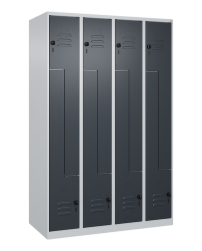Die wichtigsten Maße des C+P Garderobenschranks Classic Plus auf einen Blick:Je Abteil eine Kleiderstange mit 3 verdrehsicheren Doppelschiebehaken. Flügeltür mit Etikettenrahmen und Lüftungsschlitzen. Die innenliegenden Drehbolzen der einschlagenden Türen bieten den Vorteil einer sauberen Optik, da keine Schrauben oder Scharniere von außen sichtbar sind. Dadurch wird das Design des Schrankes nicht beeinträchtigt und das gesamte Möbelstück wirkt hochwertiger. Damit ist auch die glatte Oberfläche leichter zu reinigen, da keine Schmutz- oder Staubablagerungen an unzugänglichen Stellen zu befürchten sind. Jede Tür ist serienmäßig mit einer Anschlagsdämpfung ausgestattet, so dass, auch durch ein schwungvolles Schließen, die Tür nicht zuknallt. Das trägt nicht nur zu einer angenehmeren Geräuschkulisse bei, sondern schont auch den Stahlschrank vor Beschädigungen. Von der Natur inspiriert schafft der BIONIC Steel Frame eine besonders effiziente und stabile Konstruktion. Durch eine raffinierte innere Struktur aus Faltungen, Streben und Zwischenräumen, sowie höhere Materialstärke an entscheidenden Stellen, wie z. B. im vorderen Bereich der Seitenwände und in den Trennwand- und Kastenprofilen, wird die Verwindungssteifigkeit zusätzlich erhöht. Verschließbar mit Sicherheits-Drehriegel für Vorhängeschloss. Das Sicherheitsschloss ist besonders aufbruchsicher, da es im verschlossenen Zustand durchdreht und erst nach Entfernung des Schlosses einrastet. Passend für alle Vorhängeschlösser mit einer Bügelstärke von 6 - 8 mm. Die zusätzlichen Lüftungsöffnungen im Abteil, kombiniert mit den Lüftungsschlitzen in der Tür, verbessern den Luftstrom. Dadurch wird der Schrankinhalt besser belüftet und trocknet schneller, ohne unangenehme Gerüche zu verursachen. Für eine besonders schlanke und raumsparende Optik steht der Schrank ohne Sockel oder Füße direkt auf dem Boden. Lediglich Bodenausgleichsschrauben sorgen für einen wackelfreien Stand bei eventuellen Bodenunebenheiten. Der Schrankboden ist für einen erhöhten Korrosionsschutz zusätzlich verzinkt. Konstruktion aus Stahl, stabil verschweißt. Das macht die Konstruktion besonders robust und widerstandsfähig und somit langlebiger. Die verschweißten Ecken und Kanten des Korpus gewährleisten eine höhere Dichtigkeit und somit eine bessere Schutzfunktion gegen Staub, Feuchtigkeit und Schmutz als eine geschraubte Konstruktion. Zudem sind keine regelmäßigen Wartungsarbeiten und Nachjustierungen nötig. Korpus mit Einbrennlackierung in RAL7035 Lichtgrau, Front mit Einbrennlackierung in RAL7016 Anthrazitgrau.
