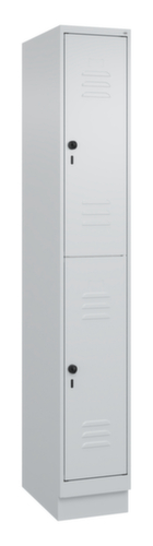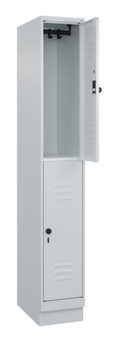 Die wichtigsten Maße des C+P Garderobenschranks Classic Plus auf einen Blick:Je Abteil 2 Schrankfächer mit je einer Kleiderstange und 3 verdrehsicheren Doppelschiebehaken. Flügeltür mit Etikettenrahmen und Lüftungsschlitzen. Die innenliegenden Drehbolzen der einschlagenden Türen bieten den Vorteil einer sauberen Optik, da keine Schrauben oder Scharniere von außen sichtbar sind. Dadurch wird das Design des Schrankes nicht beeinträchtigt und das gesamte Möbelstück wirkt hochwertiger. Damit ist auch die glatte Oberfläche leichter zu reinigen, da keine Schmutz- oder Staubablagerungen an unzugänglichen Stellen zu befürchten sind. Jede Tür ist serienmäßig mit einer Anschlagsdämpfung ausgestattet, so dass, auch durch ein schwungvolles Schließen, die Tür nicht zuknallt. Das trägt nicht nur zu einer angenehmeren Geräuschkulisse bei, sondern schont auch den Stahlschrank vor Beschädigungen. Von der Natur inspiriert schafft der BIONIC Steel Frame eine besonders effiziente und stabile Konstruktion. Durch eine raffinierte innere Struktur aus Faltungen, Streben und Zwischenräumen, sowie höhere Materialstärke an entscheidenden Stellen, wie z. B. im vorderen Bereich der Seitenwände und in den Trennwand- und Kastenprofilen, wird die Verwindungssteifigkeit zusätzlich erhöht. Verschließbar mit Sicherheits-Drehriegel für Vorhängeschloss. Das Sicherheitsschloss ist besonders aufbruchsicher, da es im verschlossenen Zustand durchdreht und erst nach Entfernung des Schlosses einrastet. Passend für alle Vorhängeschlösser mit einer Bügelstärke von 6 - 8 mm. Die zusätzlichen Lüftungsöffnungen im Abteil, kombiniert mit den Lüftungsschlitzen in der Tür, verbessern den Luftstrom. Dadurch wird der Schrankinhalt besser belüftet und trocknet schneller, ohne unangenehme Gerüche zu verursachen. Der untergebaute Sockel sorgt dafür, dass das Gewicht des Schrankes gleichmäßig auf dem Boden verteilt wird. Dies erhöht die Stabilität und der Schrank kann schwerer Lasten aufnehmen, als ein Schrank mit Füßen. Außerdem können Schmutz, Staub und Feuchtigkeit nicht unter den Schrank gelangen, was die Reinigungsfläche verkleinert. Konstruktion aus Stahl, stabil verschweißt. Das macht die Konstruktion besonders robust und widerstandsfähig und somit langlebiger. Die verschweißten Ecken und Kanten des Korpus gewährleisten eine höhere Dichtigkeit und somit eine bessere Schutzfunktion gegen Staub, Feuchtigkeit und Schmutz als eine geschraubte Konstruktion. Zudem sind keine regelmäßigen Wartungsarbeiten und Nachjustierungen nötig. Korpus mit Einbrennlackierung in RAL7035 Lichtgrau, Front mit Einbrennlackierung in RAL7035 Lichtgrau.