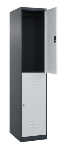 Die wichtigsten Maße des C+P Garderobenschranks Classic Plus auf einen Blick:Je Abteil 2 Schrankfächer mit je einer Kleiderstange und 3 verdrehsicheren Doppelschiebehaken. Flügeltür mit Etikettenrahmen und Lüftungsschlitzen. Die innenliegenden Drehbolzen der einschlagenden Türen bieten den Vorteil einer sauberen Optik, da keine Schrauben oder Scharniere von außen sichtbar sind. Dadurch wird das Design des Schrankes nicht beeinträchtigt und das gesamte Möbelstück wirkt hochwertiger. Damit ist auch die glatte Oberfläche leichter zu reinigen, da keine Schmutz- oder Staubablagerungen an unzugänglichen Stellen zu befürchten sind. Jede Tür ist serienmäßig mit einer Anschlagsdämpfung ausgestattet, so dass, auch durch ein schwungvolles Schließen, die Tür nicht zuknallt. Das trägt nicht nur zu einer angenehmeren Geräuschkulisse bei, sondern schont auch den Stahlschrank vor Beschädigungen. Von der Natur inspiriert schafft der BIONIC Steel Frame eine besonders effiziente und stabile Konstruktion. Durch eine raffinierte innere Struktur aus Faltungen, Streben und Zwischenräumen, sowie höhere Materialstärke an entscheidenden Stellen, wie z. B. im vorderen Bereich der Seitenwände und in den Trennwand- und Kastenprofilen, wird die Verwindungssteifigkeit zusätzlich erhöht. Verschließbar mit Zylinderschloss. Die zusätzlichen Lüftungsöffnungen im Abteil, kombiniert mit den Lüftungsschlitzen in der Tür, verbessern den Luftstrom. Dadurch wird der Schrankinhalt besser belüftet und trocknet schneller, ohne unangenehme Gerüche zu verursachen. Für eine besonders schlanke und raumsparende Optik steht der Schrank ohne Sockel oder Füße direkt auf dem Boden. Lediglich Bodenausgleichsschrauben sorgen für einen wackelfreien Stand bei eventuellen Bodenunebenheiten. Der Schrankboden ist für einen erhöhten Korrosionsschutz zusätzlich verzinkt. Konstruktion aus Stahl, stabil verschweißt. Das macht die Konstruktion besonders robust und widerstandsfähig und somit langlebiger. Die verschweißten Ecken und Kanten des Korpus gewährleisten eine höhere Dichtigkeit und somit eine bessere Schutzfunktion gegen Staub, Feuchtigkeit und Schmutz als eine geschraubte Konstruktion. Zudem sind keine regelmäßigen Wartungsarbeiten und Nachjustierungen nötig. Korpus mit Einbrennlackierung in RAL7016 Anthrazitgrau, Front mit Einbrennlackierung in RAL7035 Lichtgrau.