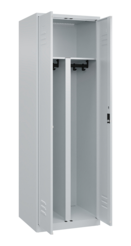 . Die wichtigsten Maße des C+P Garderobenschranks Classic Plus auf einen Blick:Je Abteil 1 stabile Garderobenstange aus Ovalprofil mit 3 verdrehsicheren Doppelschiebehaken, oberhalb ein durchgehender Hutboden über je 2 Abteile. Diese extra breite Ablage bietet den idealen Stauraum für PSA-Ausrüstung wie z. B. Helme, Augen- oder Gehörschutz. Doppel-Flügeltür mit Lüftungsschlitzen und Etikettenrahmen. Die innenliegenden Drehbolzen der einschlagenden Türen bieten den Vorteil einer sauberen Optik, da keine Schrauben oder Scharniere von außen sichtbar sind. Dadurch wird das Design des Schrankes nicht beeinträchtigt und das gesamte Möbelstück wirkt hochwertiger. Damit ist auch die glatte Oberfläche leichter zu reinigen, da keine Schmutz- oder Staubablagerungen an unzugänglichen Stellen zu befürchten sind. Jede Tür ist serienmäßig mit einer Anschlagsdämpfung ausgestattet, so dass, auch durch ein schwungvolles Schließen, die Tür nicht zuknallt. Das trägt nicht nur zu einer angenehmeren Geräuschkulisse bei, sondern schont auch den Stahlschrank vor Beschädigungen. Von der Natur inspiriert schafft der BIONIC Steel Frame eine besonders effiziente und stabile Konstruktion. Durch eine raffinierte innere Struktur aus Faltungen, Streben und Zwischenräumen, sowie höhere Materialstärke an entscheidenden Stellen, wie z. B. im vorderen Bereich der Seitenwände und in den Trennwand- und Kastenprofilen, wird die Verwindungssteifigkeit zusätzlich erhöht. Verschließbar mit Zylinderschloss. Pro Person stehen 2 Abteile zur Verfügung, die über die zueinander schlagenden Türen gemeinsam verschließbar sind. Dadurch ist eine strikte und saubere Trennung von Arbeits- und Alltagskleidung ganz einfach möglich. Die zusätzlichen Lüftungsöffnungen im Abteil, kombiniert mit den Lüftungsschlitzen in der Tür, verbessern den Luftstrom. Dadurch wird der Schrankinhalt besser belüftet und trocknet schneller, ohne unangenehme Gerüche zu verursachen. Für eine besonders schlanke und raumsparende Optik steht der Schrank ohne Sockel oder Füße direkt auf dem Boden. Lediglich Bodenausgleichsschrauben sorgen für einen wackelfreien Stand bei eventuellen Bodenunebenheiten. Der Schrankboden ist für einen erhöhten Korrosionsschutz zusätzlich verzinkt. Konstruktion aus Stahl, stabil verschweißt. Das macht die Konstruktion besonders robust und widerstandsfähig und somit langlebiger. Die verschweißten Ecken und Kanten des Korpus gewährleisten eine höhere Dichtigkeit und somit eine bessere Schutzfunktion gegen Staub, Feuchtigkeit und Schmutz als eine geschraubte Konstruktion. Zudem sind keine regelmäßigen Wartungsarbeiten und Nachjustierungen nötig. Korpus mit Einbrennlackierung in RAL7035 Lichtgrau, Front mit Einbrennlackierung in RAL7035 Lichtgrau.