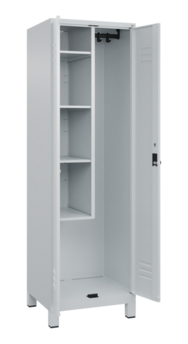 Die wichtigsten Details des C+P Putzmittelschrankes Classic Plus auf einen Blick:Über die Doppelflügeltür ist der Zugriff auf den Schrankinhalt besonders komfortabel. Die Lüftungsschlitze sorgen für eine erhöhte Belüftung und schützen somit den Inhalt des Schranks vor Feuchtigkeit und Schimmelbildung, da eine gute Luftzirkulation die Feuchtigkeit reduziert. Die innenliegenden Drehbolzen der einschlagenden Türen bieten den Vorteil einer sauberen Optik, da keine Schrauben oder Scharniere von außen sichtbar sind. Dadurch wird das Design des Schrankes nicht beeinträchtigt und das gesamte Möbelstück wirkt hochwertiger. Damit ist auch die glatte Oberfläche leichter zu reinigen, da keine Schmutz- oder Staubablagerungen an unzugänglichen Stellen zu befürchten sind. Jede Tür ist serienmäßig mit einer Anschlagsdämpfung ausgestattet, so dass, auch durch ein schwungvolles Schließen, die Tür nicht zuknallt. Das trägt nicht nur zu einer angenehmeren Geräuschkulisse bei, sondern schont auch den Stahlschrank vor Beschädigungen. 4 Ebene(n) mit Ablageboden. Die verkürzte Mitteltrennwand unterteilt den Schrank in zwei separate Bereiche, die auf verschiedene Arten und für unterschiedlich große Gegenstände genutzt werden können, lässt dabei im unteren Bereich jedoch Platz für Putzeimer oder andere Reinigungsgeräte. Links ausgestattet mit 4 Fächer mit festen Fachböden, rechts mit 1 stabile Garderobenstange aus Ovalprofil mit 4 verdrehsicheren Doppelschiebehaken. verschließbar mit Sicherheits-Drehriegel für Vorhängeschloss. Das Sicherheitsschloss ist besonders aufbruchsicher, da es im verschlossenen Zustand durchdreht und erst nach Entfernung des Schlosses einrastet. Türen gemeinsam verschließbar. Die zusätzlichen Lüftungsöffnungen im Abteil, kombiniert mit den Lüftungsschlitzen in der Tür, verbessern den Luftstrom. Dadurch wird der Schrankinhalt besser belüftet und trocknet schneller, ohne unangenehme Gerüche zu verursachen. Die untergebauten Füße aus Kunststoff verleihen dem Schrank nicht nur ein modernes und leichtes Erscheinungsbild und lassen ihn weniger massiv wirken, sondern bieten auch praktische Vorteile. Der offene Raum über dem Boden erleichtert die Reinigung und das Material Kunststoff bietet einen erhöhten Korrosionsschutz. Gerade in Umgebungen mit höheren Hygieneansprüchen ist dies ein wichtiger Aspekt. Korpus mit Einbrennlackierung in RAL7035 Lichtgrau. Front mit Einbrennlackierung in RAL7035 Lichtgrau.