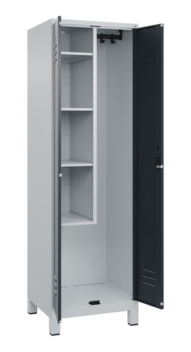 Die wichtigsten Details des C+P Putzmittelschrankes Classic Plus auf einen Blick:Über die Doppelflügeltür ist der Zugriff auf den Schrankinhalt besonders komfortabel. Die Lüftungsschlitze sorgen für eine erhöhte Belüftung und schützen somit den Inhalt des Schranks vor Feuchtigkeit und Schimmelbildung, da eine gute Luftzirkulation die Feuchtigkeit reduziert. Die innenliegenden Drehbolzen der einschlagenden Türen bieten den Vorteil einer sauberen Optik, da keine Schrauben oder Scharniere von außen sichtbar sind. Dadurch wird das Design des Schrankes nicht beeinträchtigt und das gesamte Möbelstück wirkt hochwertiger. Damit ist auch die glatte Oberfläche leichter zu reinigen, da keine Schmutz- oder Staubablagerungen an unzugänglichen Stellen zu befürchten sind. Jede Tür ist serienmäßig mit einer Anschlagsdämpfung ausgestattet, so dass, auch durch ein schwungvolles Schließen, die Tür nicht zuknallt. Das trägt nicht nur zu einer angenehmeren Geräuschkulisse bei, sondern schont auch den Stahlschrank vor Beschädigungen. 4 Ebene(n) mit Ablageboden. Die verkürzte Mitteltrennwand unterteilt den Schrank in zwei separate Bereiche, die auf verschiedene Arten und für unterschiedlich große Gegenstände genutzt werden können, lässt dabei im unteren Bereich jedoch Platz für Putzeimer oder andere Reinigungsgeräte. Links ausgestattet mit 4 Fächer mit festen Fachböden, rechts mit 1 stabile Garderobenstange aus Ovalprofil mit 4 verdrehsicheren Doppelschiebehaken. verschließbar mit Zylinderschloss. Türen gemeinsam verschließbar. Die zusätzlichen Lüftungsöffnungen im Abteil, kombiniert mit den Lüftungsschlitzen in der Tür, verbessern den Luftstrom. Dadurch wird der Schrankinhalt besser belüftet und trocknet schneller, ohne unangenehme Gerüche zu verursachen. Die untergebauten Füße aus Kunststoff verleihen dem Schrank nicht nur ein modernes und leichtes Erscheinungsbild und lassen ihn weniger massiv wirken, sondern bieten auch praktische Vorteile. Der offene Raum über dem Boden erleichtert die Reinigung und das Material Kunststoff bietet einen erhöhten Korrosionsschutz. Gerade in Umgebungen mit höheren Hygieneansprüchen ist dies ein wichtiger Aspekt. Korpus mit Einbrennlackierung in RAL7035 Lichtgrau. Front mit Einbrennlackierung in RAL7016 Anthrazitgrau.