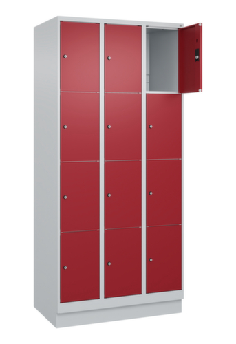 Die wichtigsten Maße des C+P Schließfachschrankes Classic Plus auf einen Blick:Korpus mit einfacher Flügeltür. Die innenliegenden Drehbolzen der einschlagenden Türen bieten den Vorteil einer sauberen Optik, da keine Schrauben oder Scharniere von außen sichtbar sind. Dadurch wird das Design des Schrankes nicht beeinträchtigt und das gesamte Möbelstück wirkt hochwertiger. Damit ist auch die glatte Oberfläche leichter zu reinigen, da keine Schmutz- oder Staubablagerungen an unzugänglichen Stellen zu befürchten sind. Jede Tür ist serienmäßig mit einer Anschlagsdämpfung ausgestattet, so dass, auch durch ein schwungvolles Schließen, die Tür nicht zuknallt. Das trägt nicht nur zu einer angenehmeren Geräuschkulisse bei, sondern schont auch den Stahlschrank vor Beschädigungen. Von der Natur inspiriert schafft der BIONIC Steel Frame eine besonders effiziente und stabile Konstruktion. Durch eine raffinierte innere Struktur aus Faltungen, Streben und Zwischenräumen, sowie höhere Materialstärke an entscheidenden Stellen, wie z. B. im vorderen Bereich der Seitenwände und in den Trennwand- und Kastenprofilen, wird die Verwindungssteifigkeit zusätzlich erhöht. Verschließbar mit Zylinderschloss. Der untergebaute Sockel sorgt dafür, dass das Gewicht des Schrankes gleichmäßig auf dem Boden verteilt wird. Dies erhöht die Stabilität und der Schrank kann schwerer Lasten aufnehmen, als ein Schrank mit Füßen. Außerdem können Schmutz, Staub und Feuchtigkeit nicht unter den Schrank gelangen, was die Reinigungsfläche verkleinert. Konstruktion aus Stahl, stabil verschweißt. Das macht die Konstruktion besonders robust und widerstandsfähig und somit langlebiger. Die verschweißten Ecken und Kanten des Korpus gewährleisten eine höhere Dichtigkeit und somit eine bessere Schutzfunktion gegen Staub, Feuchtigkeit und Schmutz als eine geschraubte Konstruktion. Zudem sind keine regelmäßigen Wartungsarbeiten und Nachjustierungen nötig. Korpus mit Einbrennlackierung in RAL7035 Lichtgrau. Front mit Einbrennlackierung in RAL3003 Rubinrot.