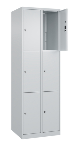 Die wichtigsten Maße des C+P Schließfachschrankes Classic Plus auf einen Blick:Korpus mit einfacher Flügeltür. Die innenliegenden Drehbolzen der einschlagenden Türen bieten den Vorteil einer sauberen Optik, da keine Schrauben oder Scharniere von außen sichtbar sind. Dadurch wird das Design des Schrankes nicht beeinträchtigt und das gesamte Möbelstück wirkt hochwertiger. Damit ist auch die glatte Oberfläche leichter zu reinigen, da keine Schmutz- oder Staubablagerungen an unzugänglichen Stellen zu befürchten sind. Jede Tür ist serienmäßig mit einer Anschlagsdämpfung ausgestattet, so dass, auch durch ein schwungvolles Schließen, die Tür nicht zuknallt. Das trägt nicht nur zu einer angenehmeren Geräuschkulisse bei, sondern schont auch den Stahlschrank vor Beschädigungen. Von der Natur inspiriert schafft der BIONIC Steel Frame eine besonders effiziente und stabile Konstruktion. Durch eine raffinierte innere Struktur aus Faltungen, Streben und Zwischenräumen, sowie höhere Materialstärke an entscheidenden Stellen, wie z. B. im vorderen Bereich der Seitenwände und in den Trennwand- und Kastenprofilen, wird die Verwindungssteifigkeit zusätzlich erhöht. Verschließbar mit Zylinderschloss. Für eine besonders schlanke und raumsparende Optik steht der Schrank ohne Sockel oder Füße direkt auf dem Boden. Lediglich Bodenausgleichsschrauben sorgen für einen wackelfreien Stand bei eventuellen Bodenunebenheiten. Der Schrankboden ist für einen erhöhten Korrosionsschutz zusätzlich verzinkt. Konstruktion aus Stahl, stabil verschweißt. Das macht die Konstruktion besonders robust und widerstandsfähig und somit langlebiger. Die verschweißten Ecken und Kanten des Korpus gewährleisten eine höhere Dichtigkeit und somit eine bessere Schutzfunktion gegen Staub, Feuchtigkeit und Schmutz als eine geschraubte Konstruktion. Zudem sind keine regelmäßigen Wartungsarbeiten und Nachjustierungen nötig. Korpus mit Einbrennlackierung in RAL7035 Lichtgrau. Front mit Einbrennlackierung in RAL7035 Lichtgrau.