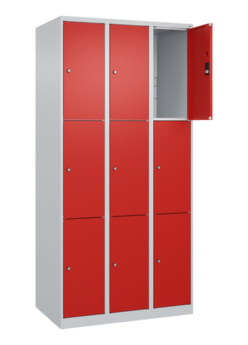 Die wichtigsten Maße des C+P Schließfachschrankes Classic Plus auf einen Blick:Korpus mit einfacher Flügeltür. Die innenliegenden Drehbolzen der einschlagenden Türen bieten den Vorteil einer sauberen Optik, da keine Schrauben oder Scharniere von außen sichtbar sind. Dadurch wird das Design des Schrankes nicht beeinträchtigt und das gesamte Möbelstück wirkt hochwertiger. Damit ist auch die glatte Oberfläche leichter zu reinigen, da keine Schmutz- oder Staubablagerungen an unzugänglichen Stellen zu befürchten sind. Jede Tür ist serienmäßig mit einer Anschlagsdämpfung ausgestattet, so dass, auch durch ein schwungvolles Schließen, die Tür nicht zuknallt. Das trägt nicht nur zu einer angenehmeren Geräuschkulisse bei, sondern schont auch den Stahlschrank vor Beschädigungen. Von der Natur inspiriert schafft der BIONIC Steel Frame eine besonders effiziente und stabile Konstruktion. Durch eine raffinierte innere Struktur aus Faltungen, Streben und Zwischenräumen, sowie höhere Materialstärke an entscheidenden Stellen, wie z. B. im vorderen Bereich der Seitenwände und in den Trennwand- und Kastenprofilen, wird die Verwindungssteifigkeit zusätzlich erhöht. Verschließbar mit Zylinderschloss. Für eine besonders schlanke und raumsparende Optik steht der Schrank ohne Sockel oder Füße direkt auf dem Boden. Lediglich Bodenausgleichsschrauben sorgen für einen wackelfreien Stand bei eventuellen Bodenunebenheiten. Der Schrankboden ist für einen erhöhten Korrosionsschutz zusätzlich verzinkt. Konstruktion aus Stahl, stabil verschweißt. Das macht die Konstruktion besonders robust und widerstandsfähig und somit langlebiger. Die verschweißten Ecken und Kanten des Korpus gewährleisten eine höhere Dichtigkeit und somit eine bessere Schutzfunktion gegen Staub, Feuchtigkeit und Schmutz als eine geschraubte Konstruktion. Zudem sind keine regelmäßigen Wartungsarbeiten und Nachjustierungen nötig. Korpus mit Einbrennlackierung in RAL7035 Lichtgrau. Front mit Einbrennlackierung in RAL3020 Verkehrsrot.