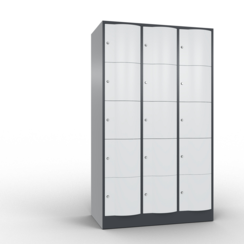 Die nach vorne gewölbte Flügeltür ist absolut stabil und vandalismussicher, sogar gegen Fußtritte. Die einschlagenden Türen sind in robusten, innenliegenden Drehstangenscharnieren aufgehängt und halte damit auch hohen Beanspruchungen stand. Jede Tür ist serienmäßig mit einer Anschlagsdämpfung ausgestattet, so dass, auch durch ein schwungvolles Schließen, die Tür nicht zuknallt. Das trägt nicht nur zu einer angenehmeren Geräuschkulisse bei, sondern schont auch den Stahlschrank vor Beschädigungen. Zudem schützt die Türöffnungsbegrenzung vor einer Überdehnung der Tür und vor der Überschneidung der Nutzfläche mit dem Nachbarschrank. Verschließbar mit Zylinderschloss. Die Lüftungsöffnungen in der Rückwand stellen eine gute Luftzirkulation in jedem Schrankfach sicher. Durch die Abdeckplatte kann der Beistellschrank als zusätzliche Arbeits- oder Ablagefläche genutzt werden. Der untergebaute Sockel sorgt dafür, dass das Gewicht des Schrankes gleichmäßig auf dem Boden verteilt wird. Dies erhöht die Stabilität und der Schrank kann schwerer Lasten aufnehmen, als ein Schrank mit Füßen. Außerdem können Schmutz, Staub und Feuchtigkeit nicht unter den Schrank gelangen, was die Reinigungsfläche verkleinert. Konstruktion aus Stahlblech, verschweißt. Korpus mit Einbrennlackierung. Front mit Einbrennlackierung.