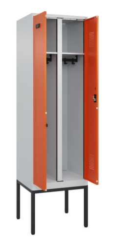 Die wichtigsten Maße des C+P Garderobenschranks Evolo PLUS auf einen Blick:Je Abteil ein festverschweißter Hutboden und darunter eine Kleiderstange mit 3 verdrehsicheren Doppelschiebehaken. Die Doppel-Flügeltüren können über den Comfort-Etikettrahmen ganz einfach personalisiert werden. Dank des Desinglochbildes, was essentiell zur Belüftung beiträgt, bleibt der Schrank trotzdem in seinem gesamten Erscheinungsbild glatt, hygienisch und leicht zu reinigen. Die innenliegenden Drehbolzen der einschlagenden Türen bieten den Vorteil einer sauberen Optik, da keine Schrauben oder Scharniere von außen sichtbar sind. Dadurch wird das Design des Schrankes nicht beeinträchtigt und das gesamte Möbelstück wirkt hochwertiger. Damit ist auch die glatte Oberfläche leichter zu reinigen, da keine Schmutz- oder Staubablagerungen an unzugänglichen Stellen zu befürchten sind. Jede Tür ist serienmäßig mit einer Anschlagsdämpfung ausgestattet, so dass, auch durch ein schwungvolles Schließen, die Tür nicht zuknallt. Das trägt nicht nur zu einer angenehmeren Geräuschkulisse bei, sondern schont auch den Stahlschrank vor Beschädigungen. Von der Natur inspiriert schafft der BIONIC Steel Frame eine besonders effiziente und stabile Konstruktion. Durch eine raffinierte innere Struktur aus Faltungen, Streben und Zwischenräumen, sowie höhere Materialstärke an entscheidenden Stellen, wie z. B. im vorderen Bereich der Seitenwände und in den Trennwand- und Kastenprofilen, wird die Verwindungssteifigkeit zusätzlich erhöht. Verschließbar mit Zylinderschloss. Pro Person stehen 2 Abteile zur Verfügung, die über die zueinander schlagenden Türen gemeinsam verschließbar sind. Dadurch ist eine strikte und saubere Trennung von Arbeits- und Alltagskleidung ganz einfach möglich. Das durchdachte Selbstbelüftungskonzept ermöglicht einen konstruktiv optimierte Luftzirkulation. Definierte Lüftungsfreiräume vor und hinter dem Ablageboden, Lüftungsöffnungen in Abteilboden und -dach, in Kombination mit dem Lochbild in der Tür, tragen zu einer angenehmen Strömungsverlauf bei. . Dadurch wird der Schrankinhalt ausreichend belüftet und trocknet schneller, ohne unangenehme Gerüche zu verursachen. Das untergebaute Fußgestell reduziert mögliche Ansammlungen von Schmutz und Staub, da eine vollflächige Reinigung einfach möglich ist. Zudem wird zusätzlicher Stauraum unter dem Schrank geschaffen. Schuhe und Taschen stehen nicht mehr im Raum und stellen weniger Stolpergefahr dar. Konstruktion aus Stahl, stabil verschweißt. Das macht die Konstruktion besonders robust und widerstandsfähig und somit langlebiger. Die verschweißten Ecken und Kanten des Korpus gewährleisten eine höhere Dichtigkeit und somit eine bessere Schutzfunktion gegen Staub, Feuchtigkeit und Schmutz als eine geschraubte Konstruktion. Zudem sind keine regelmäßigen Wartungsarbeiten und Nachjustierungen nötig. Korpus mit Einbrennlackierung in RAL7035 Lichtgrau, Front mit Einbrennlackierung in RAL2004 Reinorange.