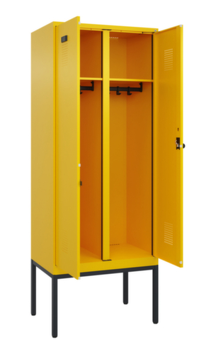 Die wichtigsten Maße des C+P Garderobenschranks Evolo PLUS auf einen Blick:Je Abteil ein festverschweißter Hutboden und darunter eine Kleiderstange mit 3 verdrehsicheren Doppelschiebehaken. Die Doppel-Flügeltüren können über den Comfort-Etikettrahmen ganz einfach personalisiert werden. Dank des Desinglochbildes, was essentiell zur Belüftung beiträgt, bleibt der Schrank trotzdem in seinem gesamten Erscheinungsbild glatt, hygienisch und leicht zu reinigen. Die innenliegenden Drehbolzen der einschlagenden Türen bieten den Vorteil einer sauberen Optik, da keine Schrauben oder Scharniere von außen sichtbar sind. Dadurch wird das Design des Schrankes nicht beeinträchtigt und das gesamte Möbelstück wirkt hochwertiger. Damit ist auch die glatte Oberfläche leichter zu reinigen, da keine Schmutz- oder Staubablagerungen an unzugänglichen Stellen zu befürchten sind. Jede Tür ist serienmäßig mit einer Anschlagsdämpfung ausgestattet, so dass, auch durch ein schwungvolles Schließen, die Tür nicht zuknallt. Das trägt nicht nur zu einer angenehmeren Geräuschkulisse bei, sondern schont auch den Stahlschrank vor Beschädigungen. Von der Natur inspiriert schafft der BIONIC Steel Frame eine besonders effiziente und stabile Konstruktion. Durch eine raffinierte innere Struktur aus Faltungen, Streben und Zwischenräumen, sowie höhere Materialstärke an entscheidenden Stellen, wie z. B. im vorderen Bereich der Seitenwände und in den Trennwand- und Kastenprofilen, wird die Verwindungssteifigkeit zusätzlich erhöht. Pro Person stehen 2 Abteile zur Verfügung, die über die zueinander schlagenden Türen gemeinsam verschließbar sind. Dadurch ist eine strikte und saubere Trennung von Arbeits- und Alltagskleidung ganz einfach möglich. Das durchdachte Selbstbelüftungskonzept ermöglicht einen konstruktiv optimierte Luftzirkulation. Definierte Lüftungsfreiräume vor und hinter dem Ablageboden, Lüftungsöffnungen in Abteilboden und -dach, in Kombination mit dem Lochbild in der Tür, tragen zu einer angenehmen Strömungsverlauf bei. . Dadurch wird der Schrankinhalt ausreichend belüftet und trocknet schneller, ohne unangenehme Gerüche zu verursachen. Das untergebaute Fußgestell reduziert mögliche Ansammlungen von Schmutz und Staub, da eine vollflächige Reinigung einfach möglich ist. Zudem wird zusätzlicher Stauraum unter dem Schrank geschaffen. Schuhe und Taschen stehen nicht mehr im Raum und stellen weniger Stolpergefahr dar. Konstruktion aus Stahl, stabil verschweißt. Das macht die Konstruktion besonders robust und widerstandsfähig und somit langlebiger. Die verschweißten Ecken und Kanten des Korpus gewährleisten eine höhere Dichtigkeit und somit eine bessere Schutzfunktion gegen Staub, Feuchtigkeit und Schmutz als eine geschraubte Konstruktion. Zudem sind keine regelmäßigen Wartungsarbeiten und Nachjustierungen nötig. Korpus mit Einbrennlackierung in RAL1023 Verkehrsgelb, Front mit Einbrennlackierung in RAL1023 Verkehrsgelb.