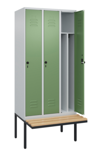 Die wichtigsten Maße des C+P Garderobenschranks Classic Plus auf einen Blick:Je Abteil Hutboden, Kleiderstange, Haken. Das Abteil wird unter dem Hutboden durch eine Mitteltrennwand unterteilt. Dadurch ist eine saubere Schwarz-Weiß-Trennung von Arbeits- und Alltagskleidung möglich. Flügeltür mit Etikettenrahmen und Lüftungsschlitzen. Die innenliegenden Drehbolzen der einschlagenden Türen bieten den Vorteil einer sauberen Optik, da keine Schrauben oder Scharniere von außen sichtbar sind. Dadurch wird das Design des Schrankes nicht beeinträchtigt und das gesamte Möbelstück wirkt hochwertiger. Damit ist auch die glatte Oberfläche leichter zu reinigen, da keine Schmutz- oder Staubablagerungen an unzugänglichen Stellen zu befürchten sind. Jede Tür ist serienmäßig mit einer Anschlagsdämpfung ausgestattet, so dass, auch durch ein schwungvolles Schließen, die Tür nicht zuknallt. Das trägt nicht nur zu einer angenehmeren Geräuschkulisse bei, sondern schont auch den Stahlschrank vor Beschädigungen. Von der Natur inspiriert schafft der BIONIC Steel Frame eine besonders effiziente und stabile Konstruktion. Durch eine raffinierte innere Struktur aus Faltungen, Streben und Zwischenräumen, sowie höhere Materialstärke an entscheidenden Stellen, wie z. B. im vorderen Bereich der Seitenwände und in den Trennwand- und Kastenprofilen, wird die Verwindungssteifigkeit zusätzlich erhöht. Verschließbar mit Sicherheits-Drehriegel für Vorhängeschloss. Das Sicherheitsschloss ist besonders aufbruchsicher, da es im verschlossenen Zustand durchdreht und erst nach Entfernung des Schlosses einrastet. Passend für alle Vorhängeschlösser mit einer Bügelstärke von 6 - 8 mm. Die zusätzlichen Lüftungsöffnungen im Abteil, kombiniert mit den Lüftungsschlitzen in der Tür, verbessern den Luftstrom. Dadurch wird der Schrankinhalt besser belüftet und trocknet schneller, ohne unangenehme Gerüche zu verursachen. vorgebaute Sitzbank. Die Leisten sind aus Buchenholz. Konstruktion aus Stahl, stabil verschweißt. Das macht die Konstruktion besonders robust und widerstandsfähig und somit langlebiger. Die verschweißten Ecken und Kanten des Korpus gewährleisten eine höhere Dichtigkeit und somit eine bessere Schutzfunktion gegen Staub, Feuchtigkeit und Schmutz als eine geschraubte Konstruktion. Zudem sind keine regelmäßigen Wartungsarbeiten und Nachjustierungen nötig. Korpus mit Einbrennlackierung in RAL7035 Lichtgrau, Front mit Einbrennlackierung in RAL6011 Resedagrün.