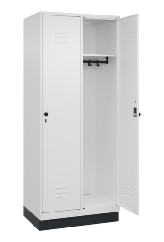 Die wichtigsten Maße des C+P Garderobenschranks Classic Plus auf einen Blick:Je Abteil ein festverschweißter Hutboden und darunter eine Kleiderstange mit 3 verdrehsicheren Doppelschiebehaken. Flügeltür mit Etikettenrahmen und Lüftungsschlitzen. Die innenliegenden Drehbolzen der einschlagenden Türen bieten den Vorteil einer sauberen Optik, da keine Schrauben oder Scharniere von außen sichtbar sind. Dadurch wird das Design des Schrankes nicht beeinträchtigt und das gesamte Möbelstück wirkt hochwertiger. Damit ist auch die glatte Oberfläche leichter zu reinigen, da keine Schmutz- oder Staubablagerungen an unzugänglichen Stellen zu befürchten sind. Jede Tür ist serienmäßig mit einer Anschlagsdämpfung ausgestattet, so dass, auch durch ein schwungvolles Schließen, die Tür nicht zuknallt. Das trägt nicht nur zu einer angenehmeren Geräuschkulisse bei, sondern schont auch den Stahlschrank vor Beschädigungen. Von der Natur inspiriert schafft der BIONIC Steel Frame eine besonders effiziente und stabile Konstruktion. Durch eine raffinierte innere Struktur aus Faltungen, Streben und Zwischenräumen, sowie höhere Materialstärke an entscheidenden Stellen, wie z. B. im vorderen Bereich der Seitenwände und in den Trennwand- und Kastenprofilen, wird die Verwindungssteifigkeit zusätzlich erhöht. Verschließbar mit Sicherheits-Drehriegel für Vorhängeschloss. Das Sicherheitsschloss ist besonders aufbruchsicher, da es im verschlossenen Zustand durchdreht und erst nach Entfernung des Schlosses einrastet. Passend für alle Vorhängeschlösser mit einer Bügelstärke von 6 - 8 mm. Die zusätzlichen Lüftungsöffnungen im Abteil, kombiniert mit den Lüftungsschlitzen in der Tür, verbessern den Luftstrom. Dadurch wird der Schrankinhalt besser belüftet und trocknet schneller, ohne unangenehme Gerüche zu verursachen. Der untergebaute Sockel sorgt dafür, dass das Gewicht des Schrankes gleichmäßig auf dem Boden verteilt wird. Dies erhöht die Stabilität und der Schrank kann schwerer Lasten aufnehmen, als ein Schrank mit Füßen. Außerdem können Schmutz, Staub und Feuchtigkeit nicht unter den Schrank gelangen, was die Reinigungsfläche verkleinert. Konstruktion aus Stahl, stabil verschweißt. Das macht die Konstruktion besonders robust und widerstandsfähig und somit langlebiger. Die verschweißten Ecken und Kanten des Korpus gewährleisten eine höhere Dichtigkeit und somit eine bessere Schutzfunktion gegen Staub, Feuchtigkeit und Schmutz als eine geschraubte Konstruktion. Zudem sind keine regelmäßigen Wartungsarbeiten und Nachjustierungen nötig. Korpus mit Einbrennlackierung in RAL9016 Verkehrsweiß, Front mit Einbrennlackierung in RAL9016 Verkehrsweiß.
