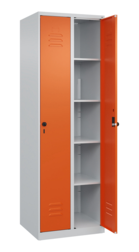 Die wichtigsten Maße des C+P Wäscheschranks Classic Plus auf einen Blick:Je Abteil 4 feste Fachböden. Flügeltür mit Etikettenrahmen und Lüftungsschlitzen. Die innenliegenden Drehbolzen der einschlagenden Türen bieten den Vorteil einer sauberen Optik, da keine Schrauben oder Scharniere von außen sichtbar sind. Dadurch wird das Design des Schrankes nicht beeinträchtigt und das gesamte Möbelstück wirkt hochwertiger. Damit ist auch die glatte Oberfläche leichter zu reinigen, da keine Schmutz- oder Staubablagerungen an unzugänglichen Stellen zu befürchten sind. Jede Tür ist serienmäßig mit einer Anschlagsdämpfung ausgestattet, so dass, auch durch ein schwungvolles Schließen, die Tür nicht zuknallt. Das trägt nicht nur zu einer angenehmeren Geräuschkulisse bei, sondern schont auch den Stahlschrank vor Beschädigungen. Von der Natur inspiriert schafft der BIONIC Steel Frame eine besonders effiziente und stabile Konstruktion. Durch eine raffinierte innere Struktur aus Faltungen, Streben und Zwischenräumen, sowie höhere Materialstärke an entscheidenden Stellen, wie z. B. im vorderen Bereich der Seitenwände und in den Trennwand- und Kastenprofilen, wird die Verwindungssteifigkeit zusätzlich erhöht. Verschließbar mit Sicherheits-Drehriegel für Vorhängeschloss. Das Sicherheitsschloss ist besonders aufbruchsicher, da es im verschlossenen Zustand durchdreht und erst nach Entfernung des Schlosses einrastet. Passend für alle Vorhängeschlösser mit einer Bügelstärke von 6 - 8 mm. Die zusätzlichen Lüftungsöffnungen im Abteil, kombiniert mit den Lüftungsschlitzen in der Tür, verbessern den Luftstrom. Dadurch wird der Schrankinhalt besser belüftet und trocknet schneller, ohne unangenehme Gerüche zu verursachen. Für eine besonders schlanke und raumsparende Optik steht der Schrank ohne Sockel oder Füße direkt auf dem Boden. Lediglich Bodenausgleichsschrauben sorgen für einen wackelfreien Stand bei eventuellen Bodenunebenheiten. Der Schrankboden ist für einen erhöhten Korrosionsschutz zusätzlich verzinkt. Konstruktion aus Stahl, stabil verschweißt. Das macht die Konstruktion besonders robust und widerstandsfähig und somit langlebiger. Die verschweißten Ecken und Kanten des Korpus gewährleisten eine höhere Dichtigkeit und somit eine bessere Schutzfunktion gegen Staub, Feuchtigkeit und Schmutz als eine geschraubte Konstruktion. Zudem sind keine regelmäßigen Wartungsarbeiten und Nachjustierungen nötig. Korpus mit Einbrennlackierung in RAL7035 Lichtgrau, Front mit Einbrennlackierung in RAL2004 Reinorange.