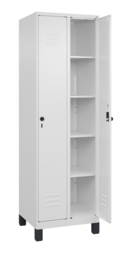 Die wichtigsten Maße des C+P Wäscheschranks Classic Plus auf einen Blick:Je Abteil 4 feste Fachböden. Flügeltür mit Etikettenrahmen und Lüftungsschlitzen. Die innenliegenden Drehbolzen der einschlagenden Türen bieten den Vorteil einer sauberen Optik, da keine Schrauben oder Scharniere von außen sichtbar sind. Dadurch wird das Design des Schrankes nicht beeinträchtigt und das gesamte Möbelstück wirkt hochwertiger. Damit ist auch die glatte Oberfläche leichter zu reinigen, da keine Schmutz- oder Staubablagerungen an unzugänglichen Stellen zu befürchten sind. Jede Tür ist serienmäßig mit einer Anschlagsdämpfung ausgestattet, so dass, auch durch ein schwungvolles Schließen, die Tür nicht zuknallt. Das trägt nicht nur zu einer angenehmeren Geräuschkulisse bei, sondern schont auch den Stahlschrank vor Beschädigungen. Von der Natur inspiriert schafft der BIONIC Steel Frame eine besonders effiziente und stabile Konstruktion. Durch eine raffinierte innere Struktur aus Faltungen, Streben und Zwischenräumen, sowie höhere Materialstärke an entscheidenden Stellen, wie z. B. im vorderen Bereich der Seitenwände und in den Trennwand- und Kastenprofilen, wird die Verwindungssteifigkeit zusätzlich erhöht. Verschließbar mit Sicherheits-Drehriegel für Vorhängeschloss. Das Sicherheitsschloss ist besonders aufbruchsicher, da es im verschlossenen Zustand durchdreht und erst nach Entfernung des Schlosses einrastet. Passend für alle Vorhängeschlösser mit einer Bügelstärke von 6 - 8 mm. Die zusätzlichen Lüftungsöffnungen im Abteil, kombiniert mit den Lüftungsschlitzen in der Tür, verbessern den Luftstrom. Dadurch wird der Schrankinhalt besser belüftet und trocknet schneller, ohne unangenehme Gerüche zu verursachen. Die untergebauten Füße aus Kunststoff verleihen dem Schrank nicht nur ein modernes und leichtes Erscheinungsbild und lassen ihn weniger massiv wirken, sondern bieten auch praktische Vorteile. Der offene Raum über dem Boden erleichtert die Reinigung und das Material Kunststoff bietet einen erhöhten Korrosionsschutz. Gerade in Umgebungen mit höheren Hygieneansprüchen ist dies ein wichtiger Aspekt. Konstruktion aus Stahl, stabil verschweißt. Das macht die Konstruktion besonders robust und widerstandsfähig und somit langlebiger. Die verschweißten Ecken und Kanten des Korpus gewährleisten eine höhere Dichtigkeit und somit eine bessere Schutzfunktion gegen Staub, Feuchtigkeit und Schmutz als eine geschraubte Konstruktion. Zudem sind keine regelmäßigen Wartungsarbeiten und Nachjustierungen nötig. Korpus mit Einbrennlackierung in RAL9016 Verkehrsweiß, Front mit Einbrennlackierung in RAL9016 Verkehrsweiß.