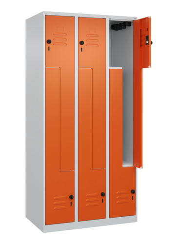 Die wichtigsten Maße des C+P Garderobenschranks Classic Plus auf einen Blick:Je Abteil eine Kleiderstange mit 3 verdrehsicheren Doppelschiebehaken. Flügeltür mit Etikettenrahmen und Lüftungsschlitzen. Die innenliegenden Drehbolzen der einschlagenden Türen bieten den Vorteil einer sauberen Optik, da keine Schrauben oder Scharniere von außen sichtbar sind. Dadurch wird das Design des Schrankes nicht beeinträchtigt und das gesamte Möbelstück wirkt hochwertiger. Damit ist auch die glatte Oberfläche leichter zu reinigen, da keine Schmutz- oder Staubablagerungen an unzugänglichen Stellen zu befürchten sind. Jede Tür ist serienmäßig mit einer Anschlagsdämpfung ausgestattet, so dass, auch durch ein schwungvolles Schließen, die Tür nicht zuknallt. Das trägt nicht nur zu einer angenehmeren Geräuschkulisse bei, sondern schont auch den Stahlschrank vor Beschädigungen. Von der Natur inspiriert schafft der BIONIC Steel Frame eine besonders effiziente und stabile Konstruktion. Durch eine raffinierte innere Struktur aus Faltungen, Streben und Zwischenräumen, sowie höhere Materialstärke an entscheidenden Stellen, wie z. B. im vorderen Bereich der Seitenwände und in den Trennwand- und Kastenprofilen, wird die Verwindungssteifigkeit zusätzlich erhöht. Verschließbar mit Sicherheits-Drehriegel für Vorhängeschloss. Das Sicherheitsschloss ist besonders aufbruchsicher, da es im verschlossenen Zustand durchdreht und erst nach Entfernung des Schlosses einrastet. Passend für alle Vorhängeschlösser mit einer Bügelstärke von 6 - 8 mm. Die zusätzlichen Lüftungsöffnungen im Abteil, kombiniert mit den Lüftungsschlitzen in der Tür, verbessern den Luftstrom. Dadurch wird der Schrankinhalt besser belüftet und trocknet schneller, ohne unangenehme Gerüche zu verursachen. Für eine besonders schlanke und raumsparende Optik steht der Schrank ohne Sockel oder Füße direkt auf dem Boden. Lediglich Bodenausgleichsschrauben sorgen für einen wackelfreien Stand bei eventuellen Bodenunebenheiten. Der Schrankboden ist für einen erhöhten Korrosionsschutz zusätzlich verzinkt. Konstruktion aus Stahl, stabil verschweißt. Das macht die Konstruktion besonders robust und widerstandsfähig und somit langlebiger. Die verschweißten Ecken und Kanten des Korpus gewährleisten eine höhere Dichtigkeit und somit eine bessere Schutzfunktion gegen Staub, Feuchtigkeit und Schmutz als eine geschraubte Konstruktion. Zudem sind keine regelmäßigen Wartungsarbeiten und Nachjustierungen nötig. Korpus mit Einbrennlackierung in RAL7035 Lichtgrau, Front mit Einbrennlackierung in RAL2004 Reinorange.